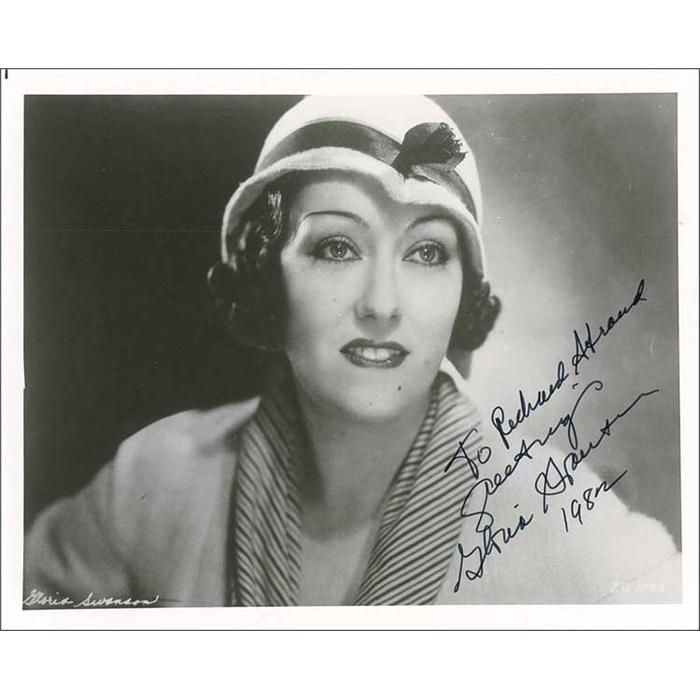 Glossy 10 x 8 photo, signed and inscribed in black felt tip “To Richard Afrand, greetings, Gloria Swanson 1982.” In fine condition, with some light surface dings, and a light horizontal line through facial area. Pre-certified PSA/DNA and RRAuction COA.