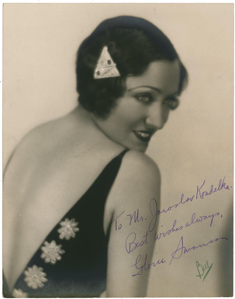 Vintage 7.5 x 9.5 Russell Ball portrait photo, signed and inscribed in purple fountain pen “To Mr. Jaroslov Koudelka, Best wishes always, Gloria Swanson.” Also signed in pencil by the photographer. Some light silvering to bottom edge and dark portions of image, otherwise fine condition. Pre-certified PSA/DNA and RRAuction COA.