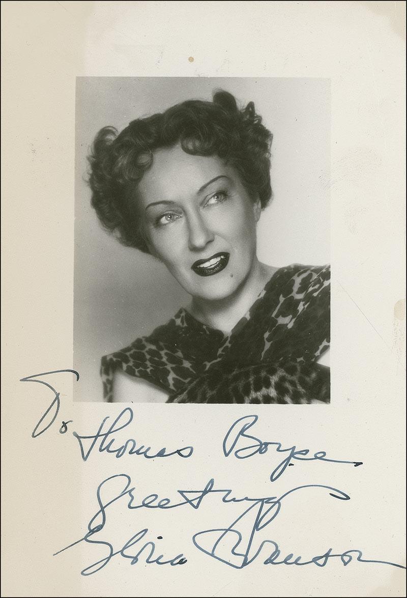Matte-finish 4.75 x 6.75 portrait as Norma Desmond, signed and inscribed in blue fountain pen, “To Thomas Boyce, Greetings, Gloria Swanson.” In very good condition, with crease along the right corner and edge, toning to the corners on the right side, and an even swatch of toning along the left side. Pre-certified PSA/DNA and RRAuction COA.