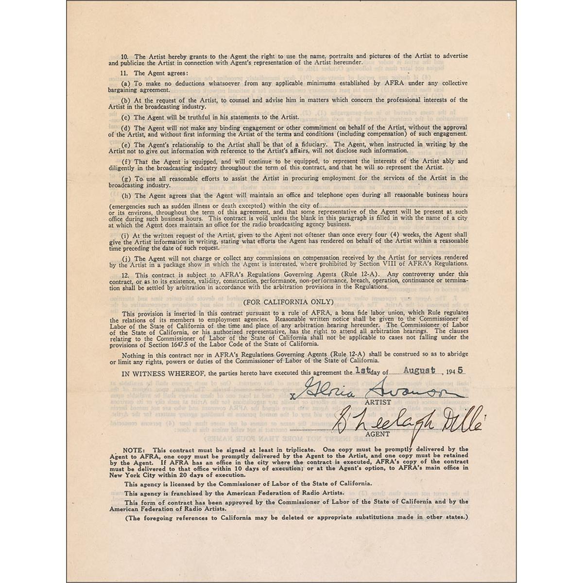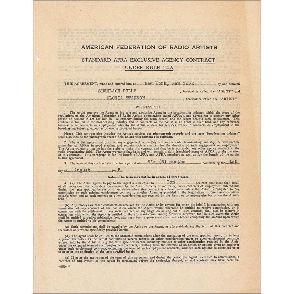 DS, two pages both sides, 8.5 x 11, August 1, 1945. Standard AFRA Exclusive Agency Contract between Swanson and her agent, Sheelagh Dille, for a six-month period at the standard ten percent. Signed at the bottom of the last page in fountain pen. In fine condition, with light uniform toning across most of the first page and two staple holes at the left edge.