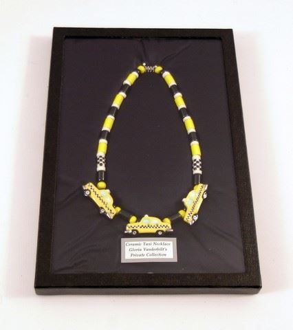 Gloria Vanderbilt Custom Famous New York Taxi Necklace - The name Gloria Vanderbilt immediately brings to mind the closest America ever came to having its own Royalty. Of course Ms. Vanderbilt didn't just rest on her blue-blood line or family money but created a massive Fashion Industry, known best for inventing the concept of expensive designer jeans (as well as being the mother of Anderson Cooper!). She is also an artist, author, actress, socialite and of course, heiress. She was well known for designing and having her own clothing, shoes, furniture and jewelry custom made for her. Inspired by her obsessive love for New York, Ms. Vanderbilt loved to create or have made for her special items that reflected the city she so adored. This is her famous custom made infamous Ceramic Taxi Necklace that she had exclusively designed and commissioned. This was one of her all time favorite pieces of jewelry and she wore it extensively. Although asked to have it reproduced, she refused to let the design go into production, making it a one-of-a-kind exclusive for her own use and enjoyment. In 1997, Ms. Vanderbilt sold part of her private collection of one-of-a-kind rare jewelry and rare antiques. This necklace was a cornerstone piece of that sale, and was purchased from her directly by a collector. The delightful unique piece is set in its own custom security Jewelry box with special locking pins. Instructions as to how to open the box and remove the necklace are written out personally by Ms. Vanderbilt. This amazing collectable also comes with a COA on Vanderbilt stationary signed personally by Gloria Vanderbilt. Custom Jewelry box is 8"x13", Necklace is approx 28" with three iconic Ceramic New York Yellow Checker Taxi Automobiles, as well as custom Yellow Checker Beads.