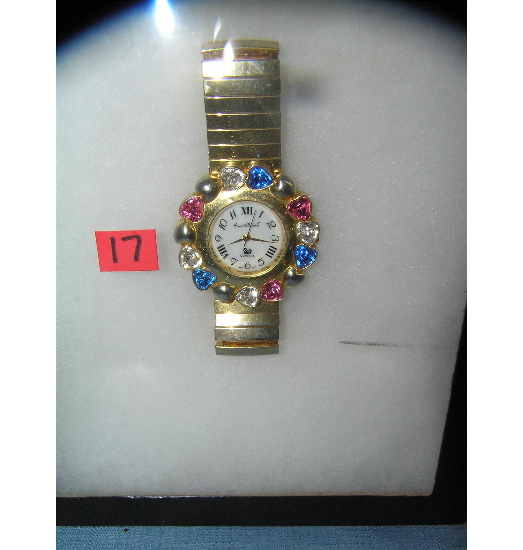 Gloria Vanderbilt high quality designer wrist watch gold toned with multi colored heart shaped stones est. value $65.00-$75.00