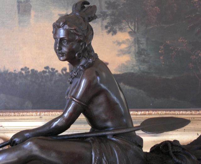 Native American Squaw in Canoe Bronze Sculpture, After Duchoiselle 13"H x15W" x 7"D 25lbs. This bronze sculpture was produced using the "Lost Wax" casting method. The"Lost Wax" Cast method is the most precise metal casting technique in existence, ensuring exquisite detail of the original host model which is usually sculpted in clay or wax. This "Lost Wax" casting method is an extremely labor intensive and expensive process, but the end results produce a Heirloom Quality Masterpiece!
