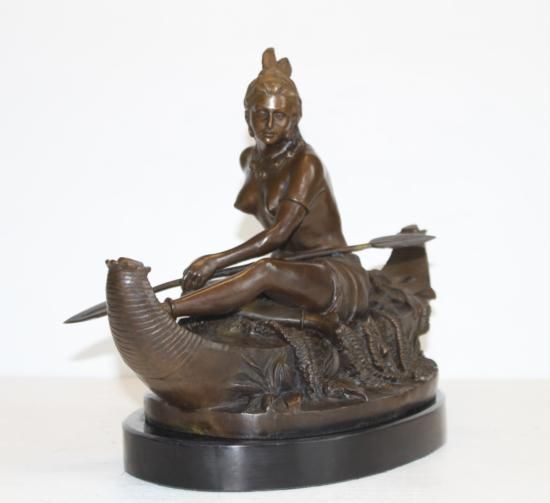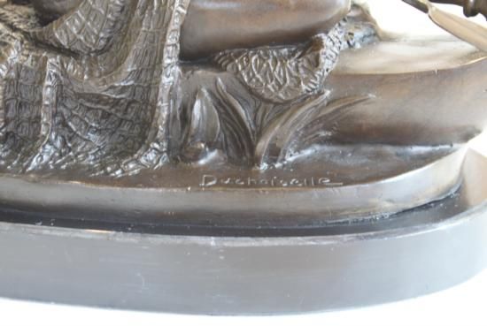 Native American Squaw in Canoe Bronze Sculpture, After Duchoiselle 13"H x15W" x 7"D 25lbs. This bronze sculpture was produced using the "Lost Wax" casting method. The"Lost Wax" Cast method is the most precise metal casting technique in existence, ensuring exquisite detail of the original host model which is usually sculpted in clay or wax. This "Lost Wax" casting method is an extremely labor intensive and expensive process, but the end results produce a Heirloom Quality Masterpiece!