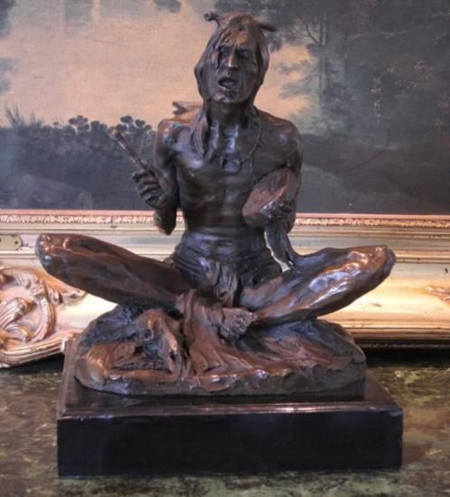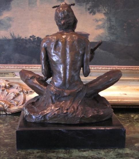 Seated Native American Indian Bronze Sculpture, 11"W x 8"H x 9"D 24 lbs. This bronze sculpture was produced using the "Lost Wax" casting method. The"Lost Wax" Cast method is the most precise metal casting technique in existence, ensuring exquisite detail of the original host model which is usually sculpted in clay or wax. This "Lost Wax" casting method is an extremely labor intensive and expensive process, but the end results produce a Heirloom Quality Masterpiece!