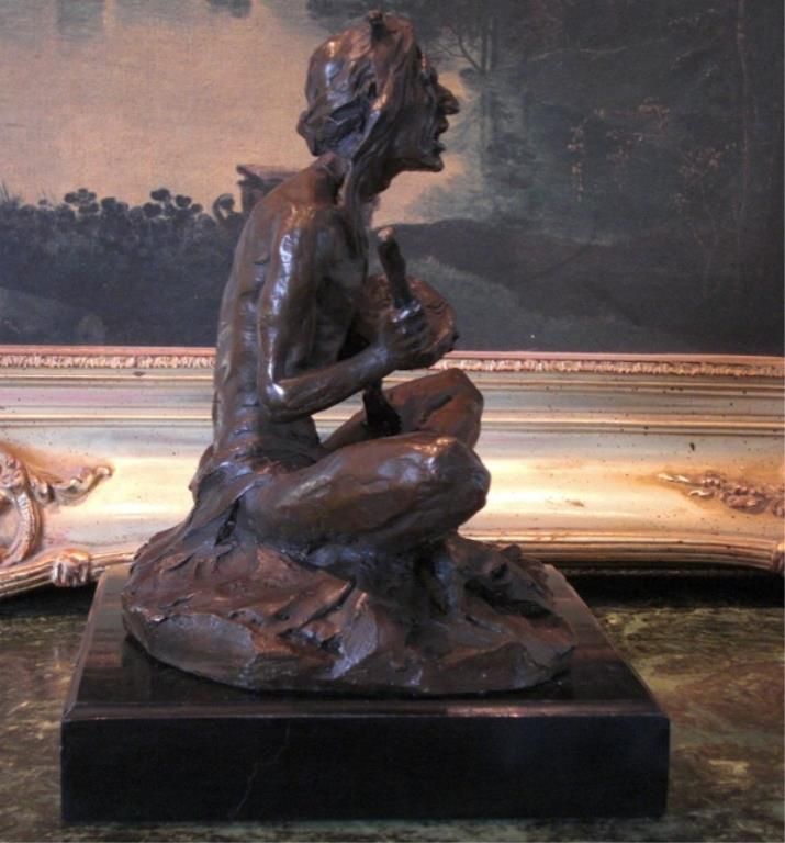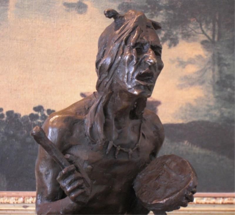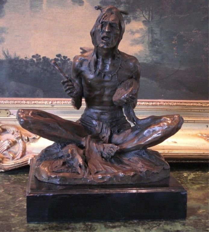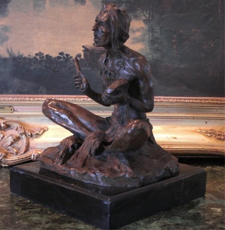 Seated Native American Indian Bronze Sculpture 11W x 8H x 9D 24 lbs. This bronze sculpture was produced using the "Lost Wax" casting method. The "Lost Wax" Cast method is the most precise metal casting technique in existence, ensuring exquisite detail of the original host model which is usually sculpted in clay or wax. This "Lost Wax" casting method is an extremely labor intensive and expensive process, but the end results produce a Heirloom Quality Masterpiece!