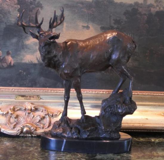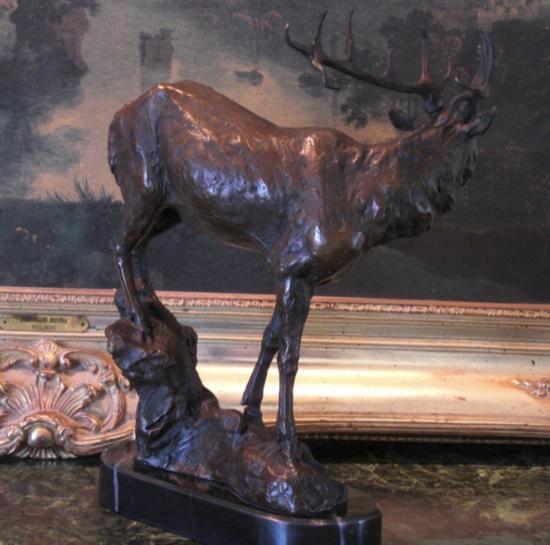 Single Standing Elk Bronze Sculpture, 14" H x 12"L x 5"D 17 lbs. This bronze sculpture was produced using the "Lost Wax" casting method. The"Lost Wax" Cast method is the most precise metal casting technique in existence, ensuring exquisite detail of the original host model which is usually sculpted in clay or wax. This "Lost Wax" casting method is an extremely labor intensive and expensive process, but the end results produce a Heirloom Quality Masterpiece!