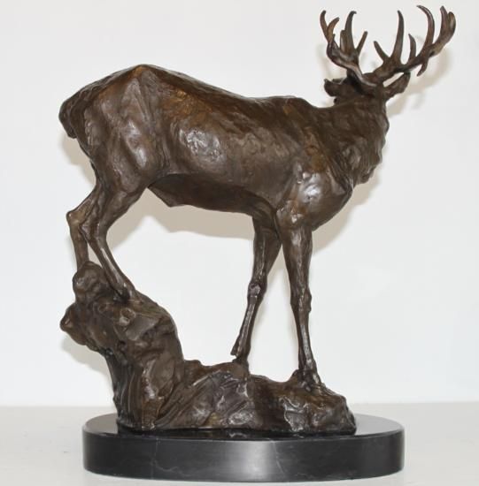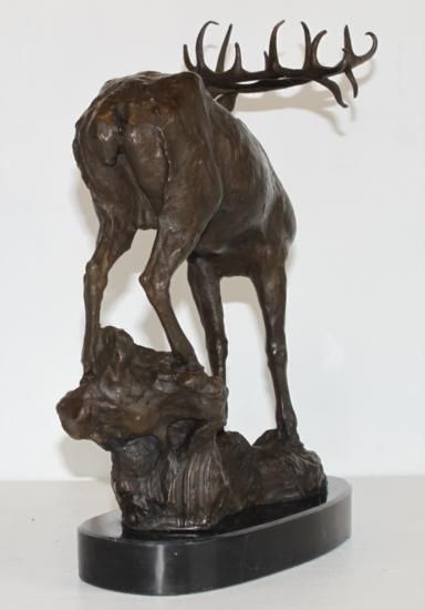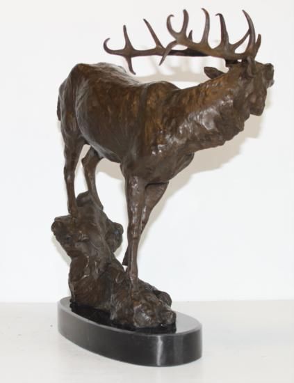 Single Standing Elk Bronze Sculpture, After Boilee 14" H x 12"L x 5"D 17 lbs. This bronze sculpture was produced using the "Lost Wax" casting method. The"Lost Wax" Cast method is the most precise metal casting technique in existence, ensuring exquisite detail of the original host model which is usually sculpted in clay or wax. This "Lost Wax" casting method is an extremely labor intensive and expensive process, but the end results produce a Heirloom Quality Masterpiece!