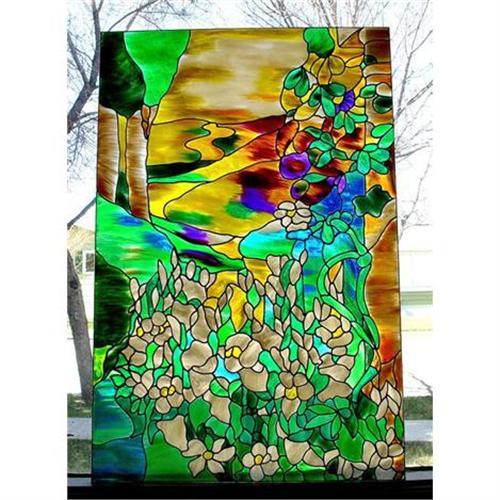 The most elaborate landscape window we offer and is guaranteed to captivate the most skeptic. A magical combination of translucent and opaque colors will transform any window into a masterpiece by day or night! The craftsmanship is superb as our photos clearly illustrate. (d1303)