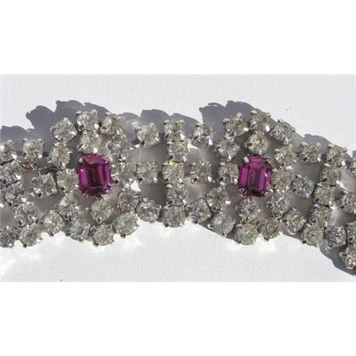 Who do you want to dazzle? Going on a cruise, trip, honeymoon? Be the stand out in any crowd with this marvelous mint condition Galé bracelet. Measures 6 ½" fully extended this piece is meant to fit snug to your wrist and has a safety chain. Two sets of fifteen brilliant cut crystals form the base at the clasp, four identical bursts of rhinestones form the bracelet itself and have 18 brilliant cut pure crystals surrounding an perfectly cut pink crystals and each of these is separated by a bar of crystals containing five brilliant cut pure crystals. Galé is extremely hard to find so don't miss this chance to add a glorious piece to your collection.