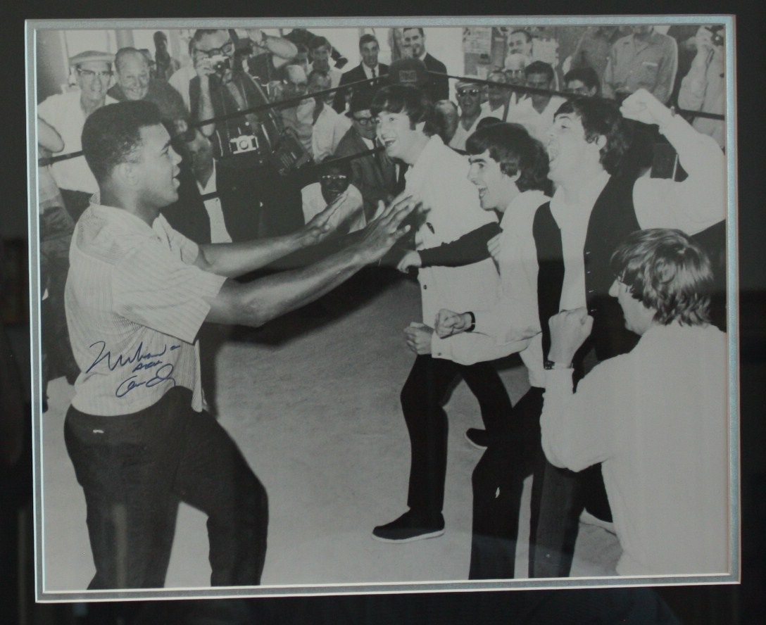 Glossy Photo with Ali and Beatles, autographed by Ali as Cassius Clay. 27" x23"