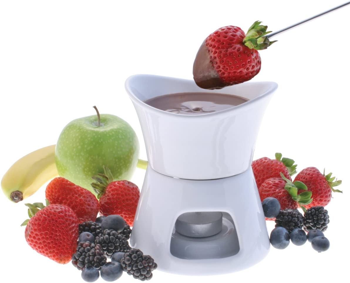 Savour something sweet or savoury with the Swissmar Glow 7 Piece Chocolate Fondue Set. Made from durable ceramic with a sturdy design, the Swissmar Glow 7 Piece Chocolate Fondue Set has a ceramic bowl and base which has a space for a tealight candle (one included). This eminates a low heat to keep your chocolate, cheese or sauce melted in the top section. The set also comes with 4 stainless steel fondue forks which are sharp enough to spike on fruit, marshmallows, bread cubes or veggies so you can serve your appetiser or dessert of choice. The Swissmar Glow 7 Piece Chocolate Fondue Set can also be used to make quick and easy appetisers or desserts ahead of time. Melt, dip and enjoy! Glow 7 Piece Chocolate Fondue Set Size 14X13X13 cm by Swissmar.