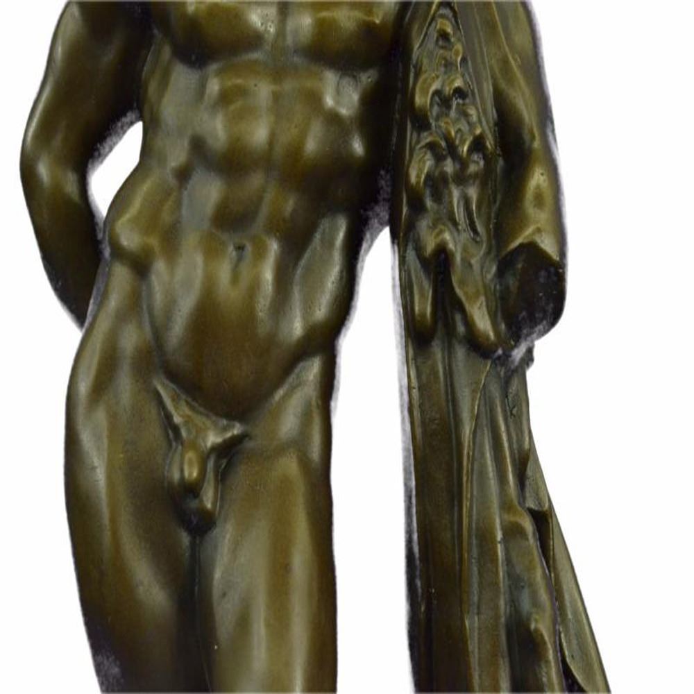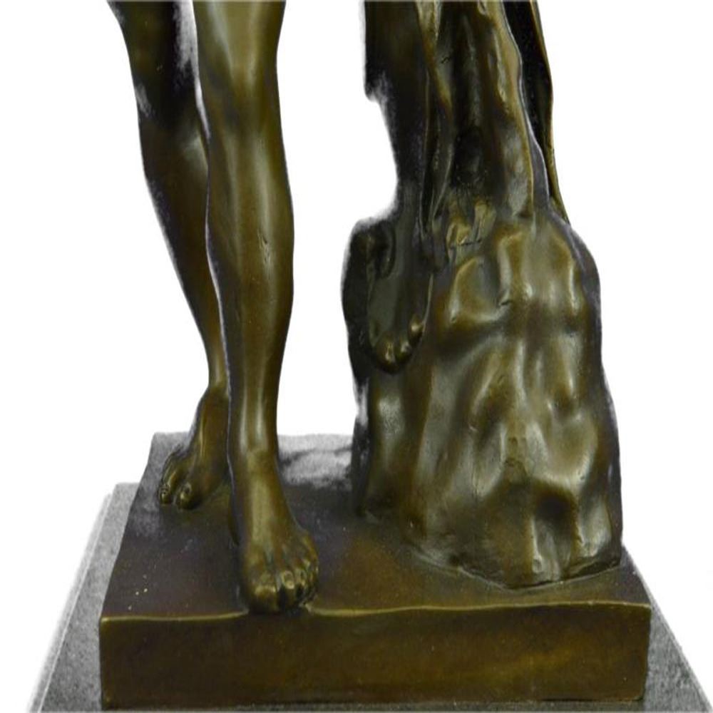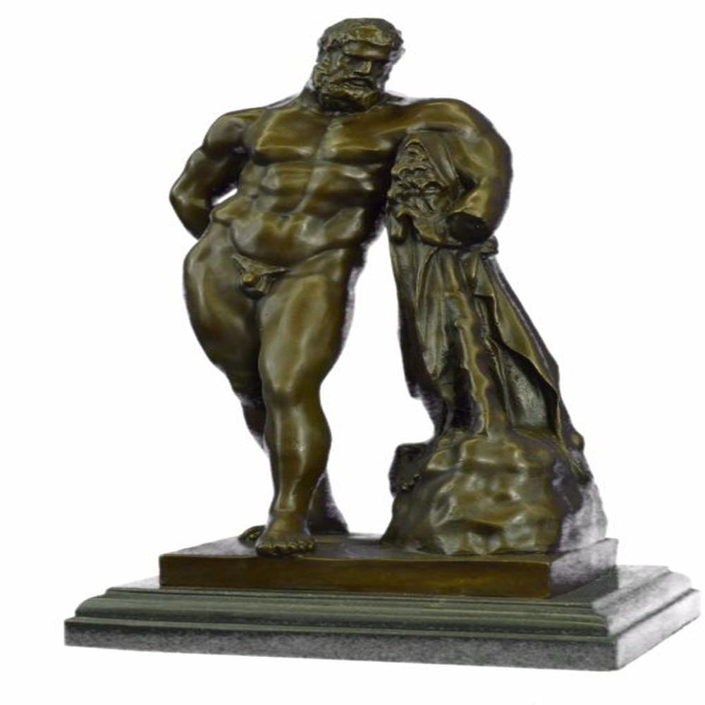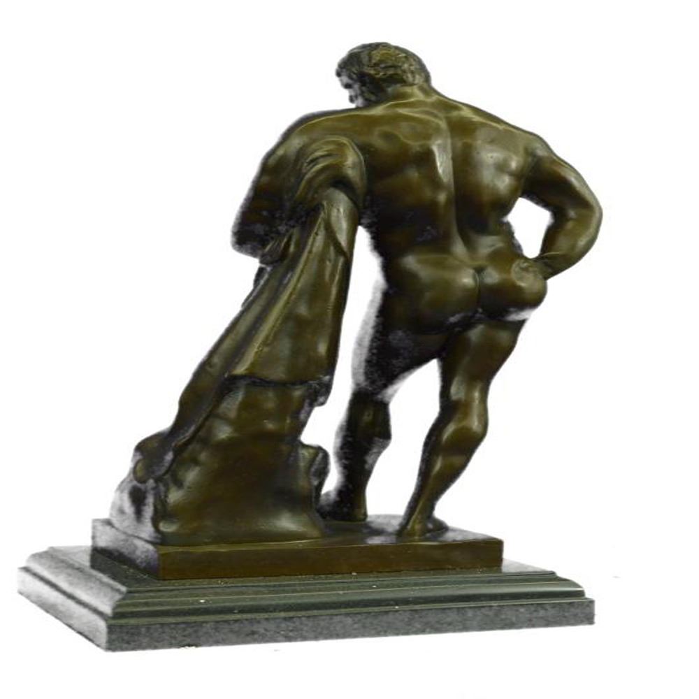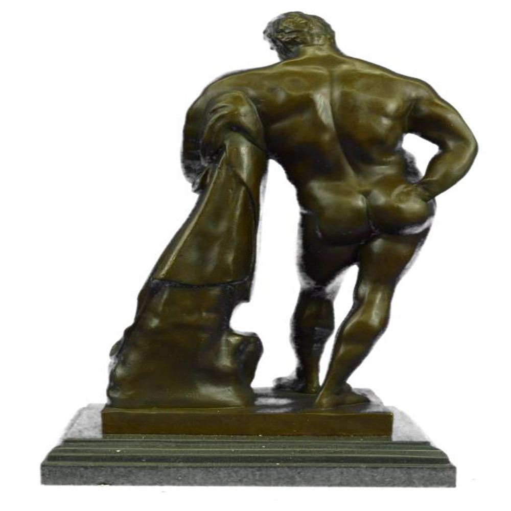 This burly man stands nude. His profound muscles are evident in every part of his body. Although his body is physically perfect, the man has suffered an injury that holds his gaze. The mans arm is without a hand. He hangs his arm over a rock staring at wrist and arm that should be. There is a complexity in this Sculpture beyond the mere physical beauty of his body. This piece would be a great addition to a home or office. The Sculpture stands on a marble base. The ancient lost wax method was used to craft this piece. Bronze Dimensions with Marble Base: Height 19 X Width 10 inches. Weight: 27 LBS.
