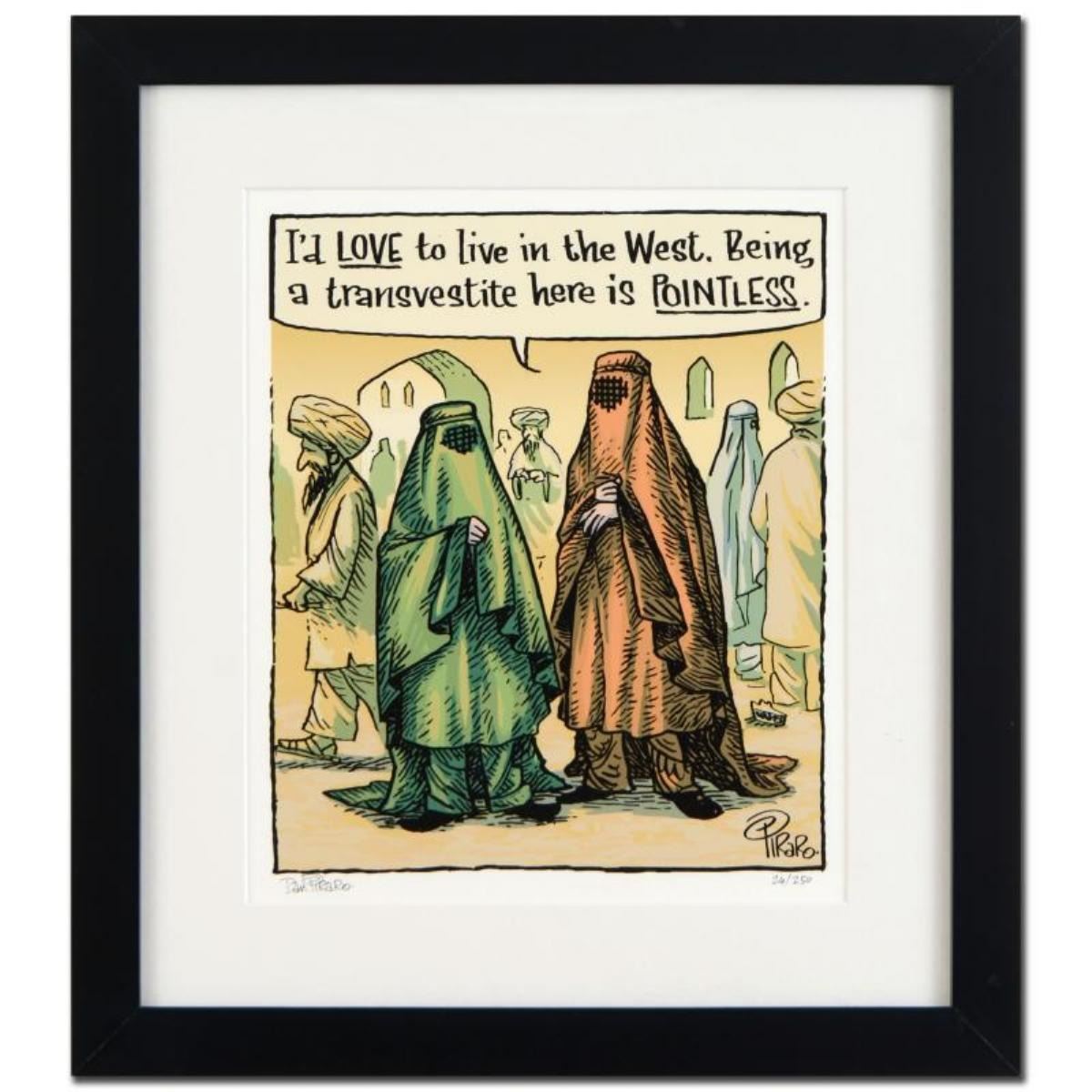Enter a surreal and satirical world of twisted imagination and award winning creativity. "Go West Young Man" is a limited edition giclee on paper by Dan Piraro, creator of the critically acclaimed and award winning comic strip, Bizarro! This piece is framed, numbered and hand signed by the artist! Includes Certificate of Authenticity! Measures approx. 17" x 19" (with frame), 9.5" x 11.5" (image).