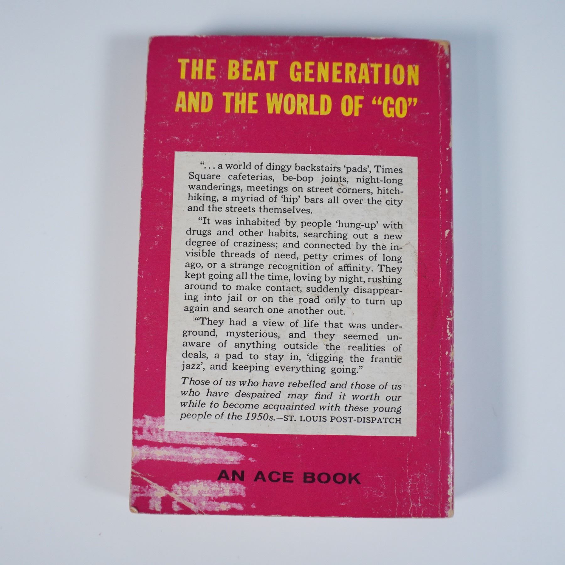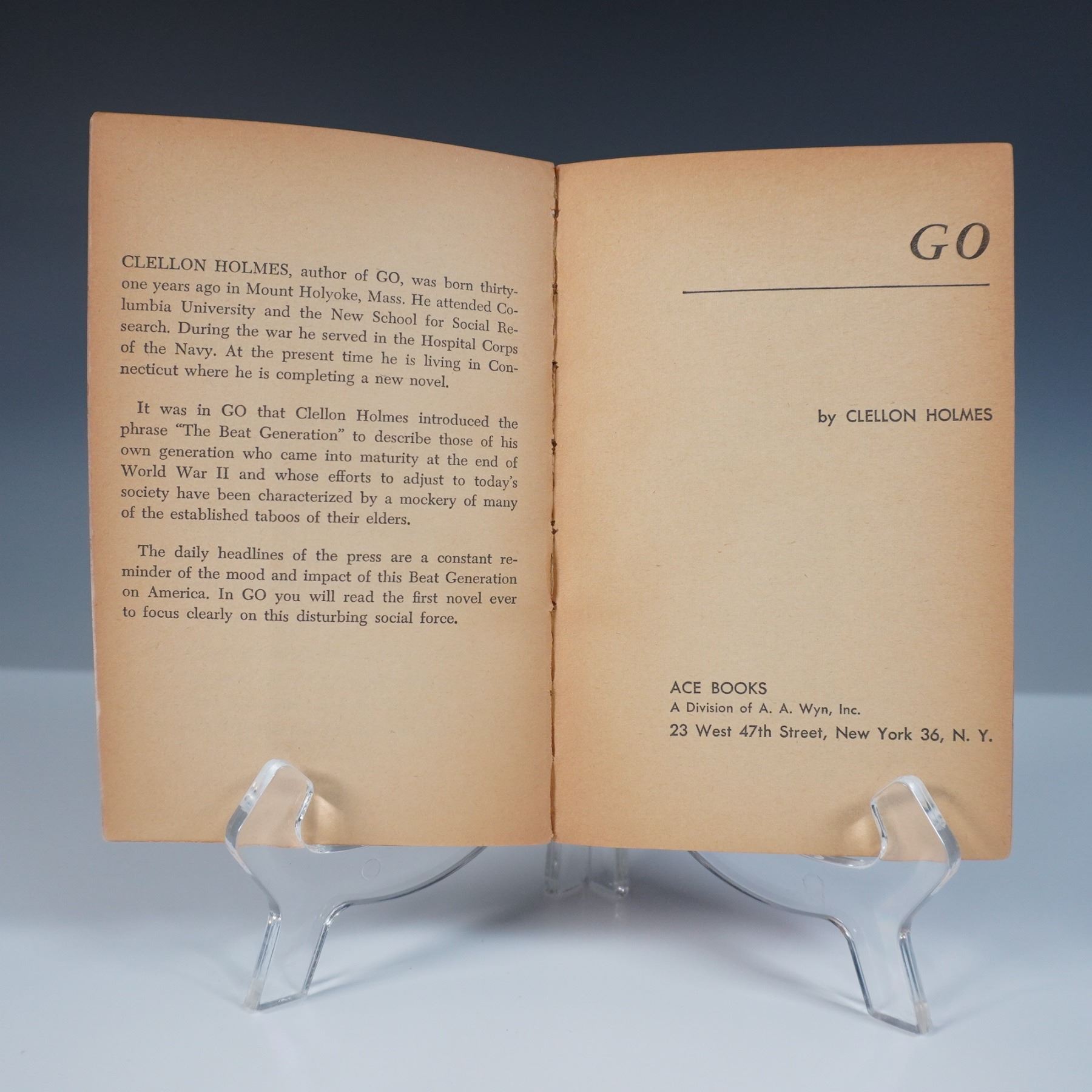 This lot features a vintage paperback edition of Go by Clellon Holmes, published by Ace Books (D-238). Originally released in 1952, this novel is recognized as the first literary work to depict the Beat Generation, a term coined by Holmes himself. The book explores the restless search for meaning among young intellectuals in post-war America, with themes of rebellion, jazz culture, and disillusionment. This Ace edition is a revised and abridged version by the author. The book measures 4"L x 6.5"H.