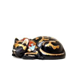 Lg Old Japanese Black Kutani Sleeping Cat Neko #1776774