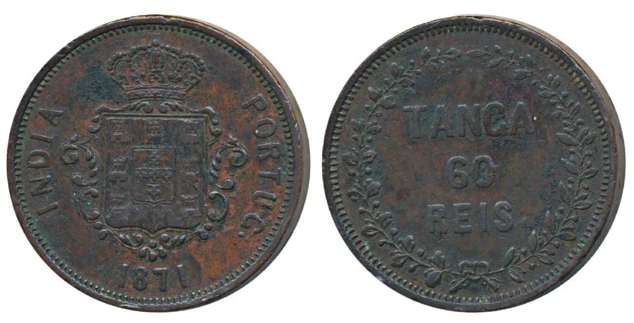 Goa, Colonial Issues, Copper 60 Reis or Tanga, 1871 (KM 306). Extremely Fine, Rare.