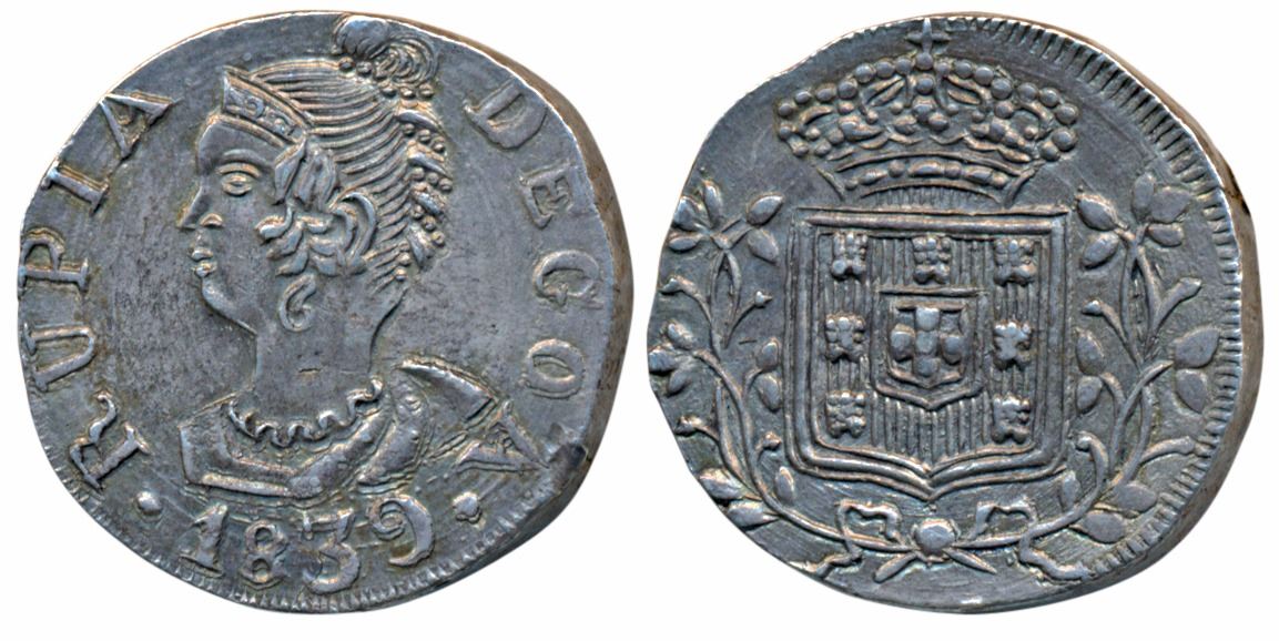 Goa, Maria II, Silver Rupia, 11.02g, 1839, obv. bust facing to left with denomination at left, and DEGOA (from Goa) at right, date 1839 below, rev. crowned arms with sprays on either side (KM 268). Well centred, Extremely Fine, Very Rare in such a high grade. A similar condition Silver Pardao sold in Todywalla Auctions 107 Lot No. 396 for Rs. 62,000.