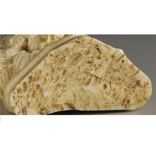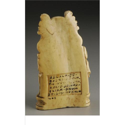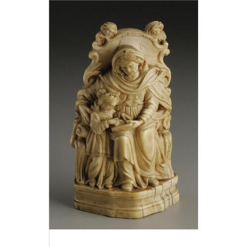 <B>A Goan Carved Ivory Figure</B></I><BR><BR>Unknown maker, India<BR>Early Eighteenth Century<BR>Ivory<BR>Marks: Inscribed on the reverse: <I>Regaldo-De-Bodas-De-Plh, Ta-……-Bal-E-Delgado Y Lira-Brum De-Sus-Hermanos</B></I><BR>5.12 in. high<BR><BR>A Goan carved ivory figure of a woman enthroned with a child by her side reading a text, flanked by angels1 <BR><BR><B>Condition Report:</B> Wear commensurate with age, old repair and small loss to one angel's wing