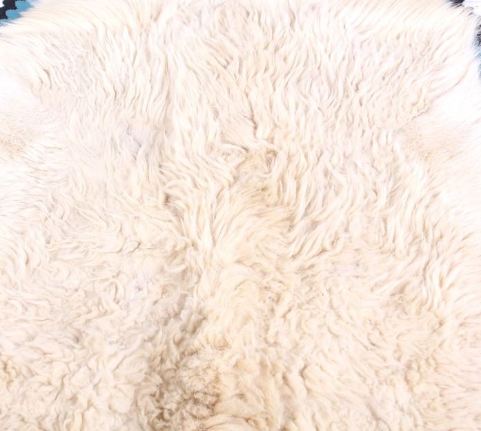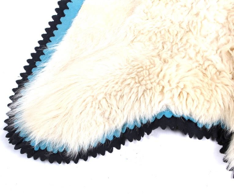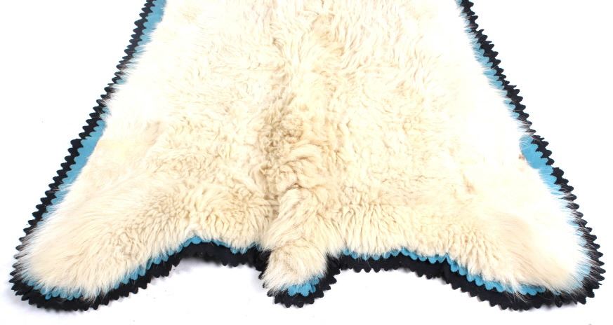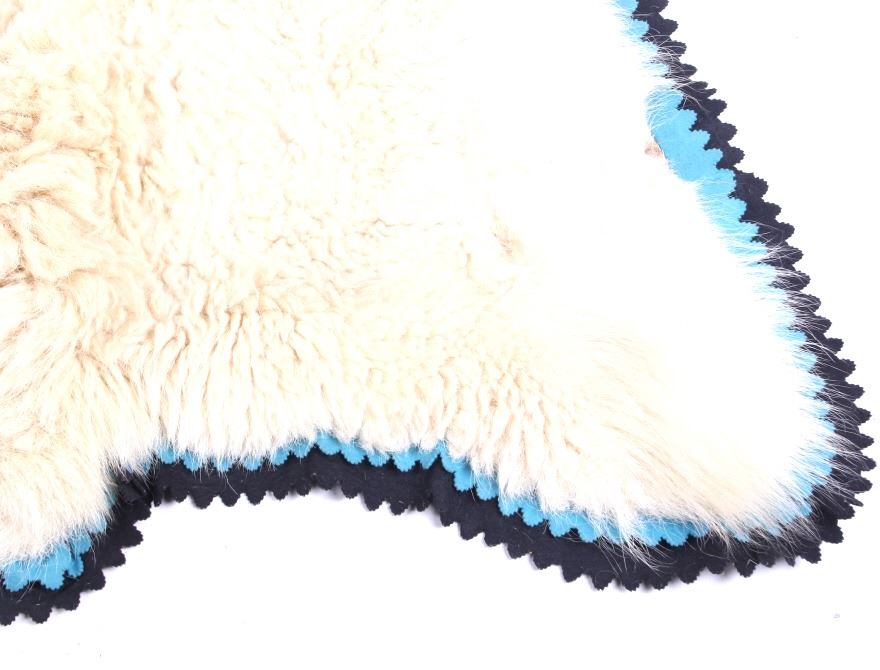 This lot features a felt mounted goat hide rug. The hide was professionally mounted by a taxidermist. It is mounted on a felt backing of black and blue. The hide has a great white tone and does not appear to be experiencing shedding. The overall condition of the piece is good for its age. Measures: 49" L x 47" W