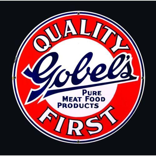 Gobels Pure Meat Food Products Porcelain Sign. Small chip at 10:00 otherwise near mint condition. 19 inch diameter.