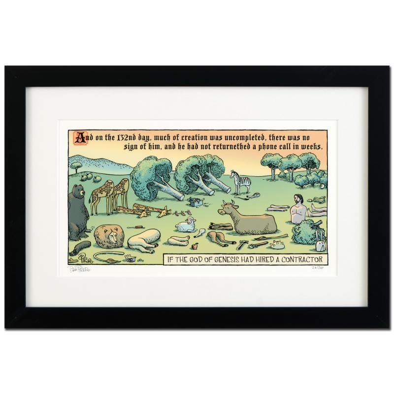 Enter a surreal and satirical world of twisted imagination and award winning creativity. "God's Contractor" is a limited edition giclee on paper by Dan Piraro, creator of the critically acclaimed and award winning comic strip, Bizarro! This piece is framed, numbered and hand signed by the artist! Includes Certificate of Authenticity! Measures approx. 22" x 15" (with frame), 15" x 8" (image).