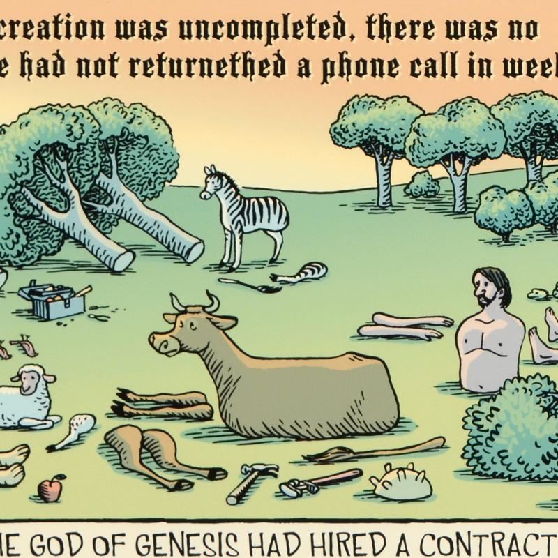Enter a surreal and satirical world of twisted imagination and award winning creativity. "God's Contractor" is a limited edition giclee on paper by Dan Piraro, creator of the critically acclaimed and award winning comic strip, Bizarro! This piece is framed, numbered and hand signed by the artist! Includes Certificate of Authenticity! Measures approx. 22" x 15" (with frame), 15" x 8" (image).
