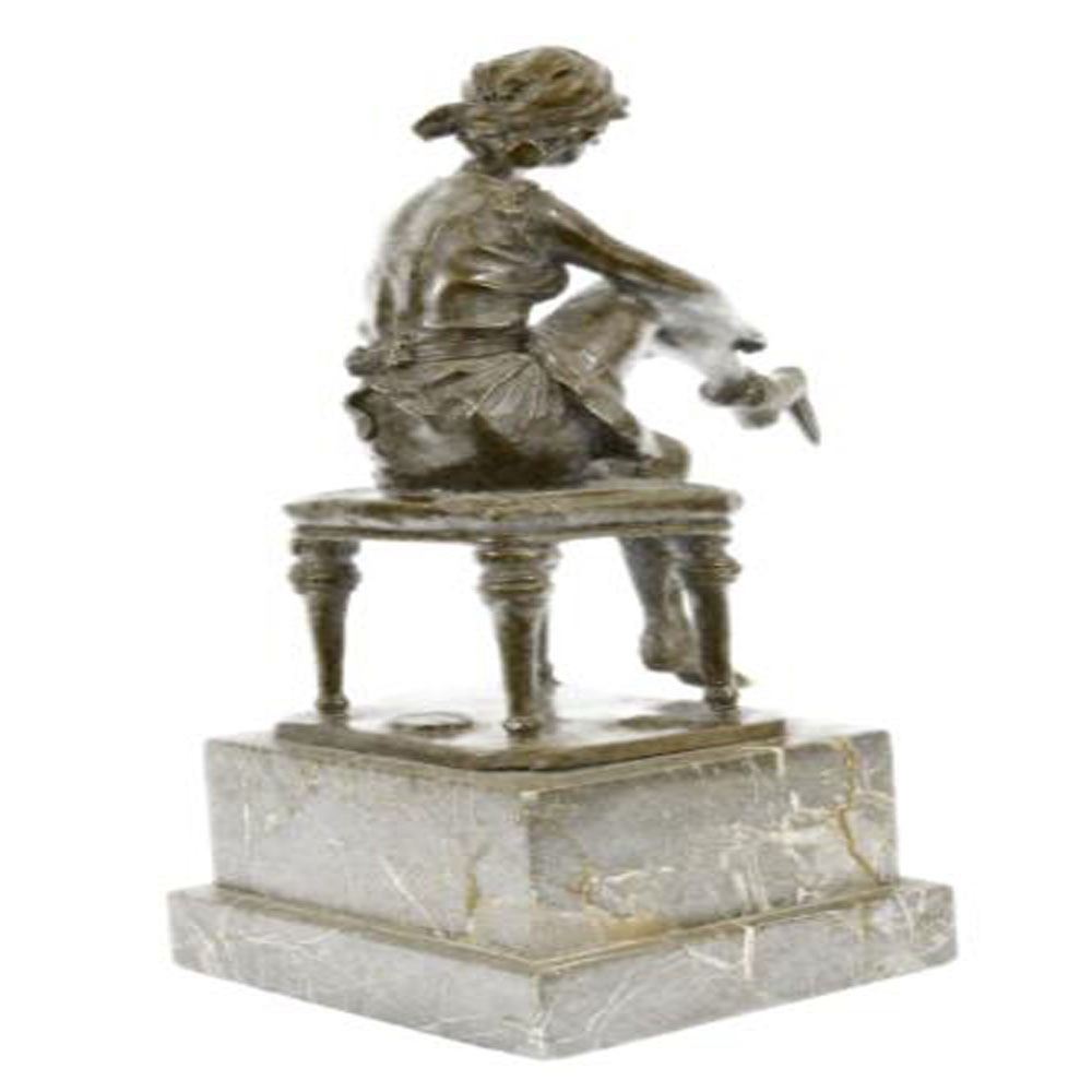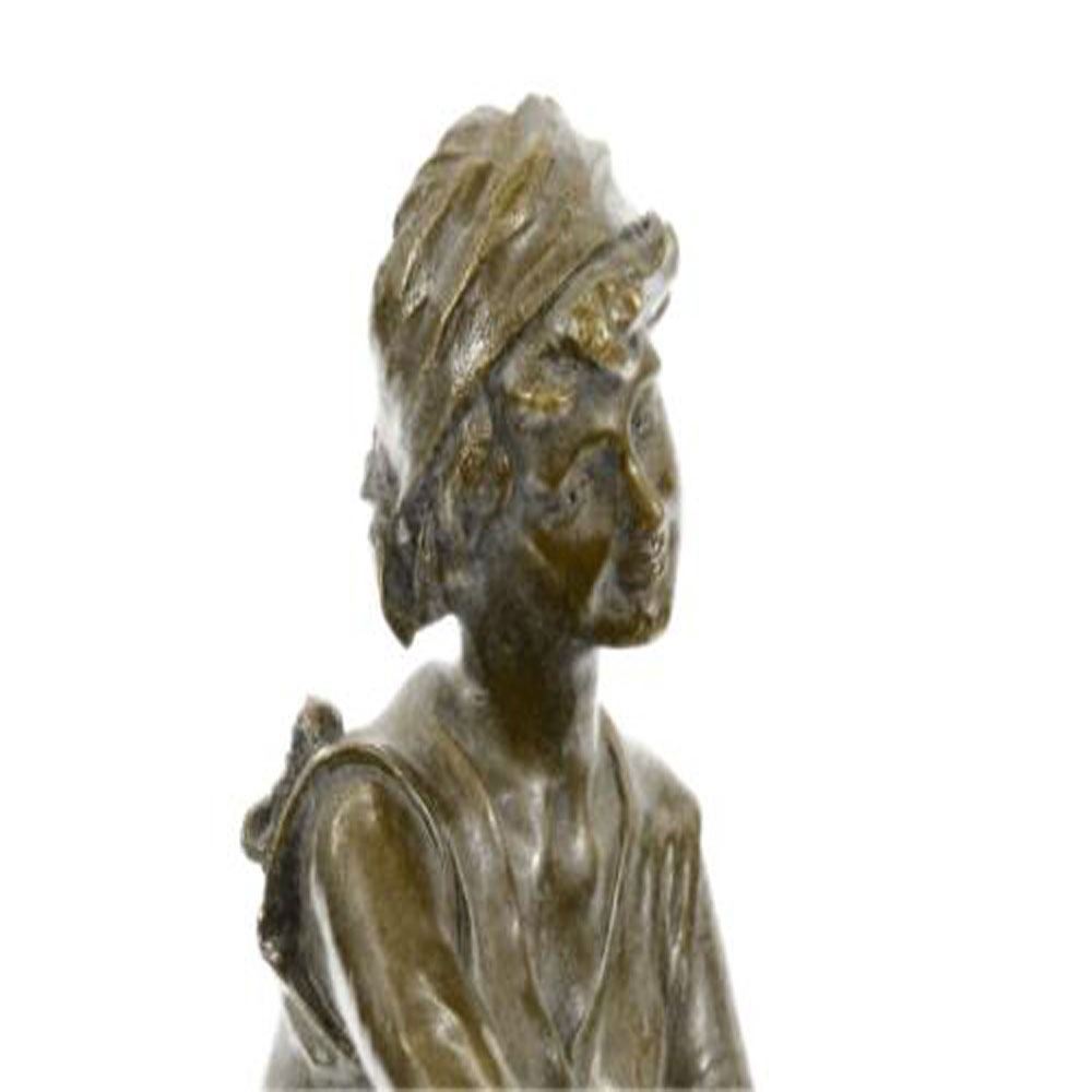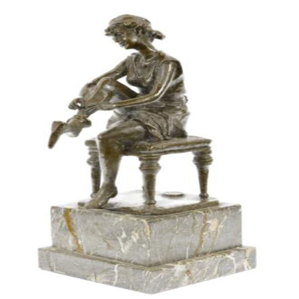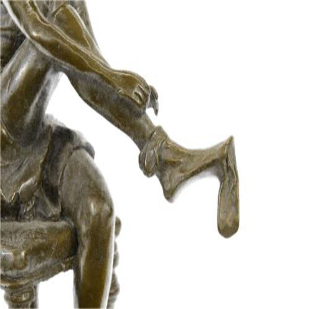 This stunning beauty sits on her nice room decorative chair as she finishes getting dressed. She smiles gracefully with a look of peace. She lifts her right leg up so she can put on her stocking on and follow it with her outfit shoe. She wears a one piece shorts body suit and a cute little hat to match with her adorable curls. This Sculpture was casted using the ancient old Lost Wax Method stained in brown patina and mounted atop a marble base. Bronze Dimensions with Marble Base: Height 14 X Width 6 inches. Weight: 16 LBS.