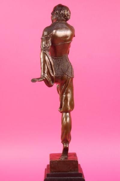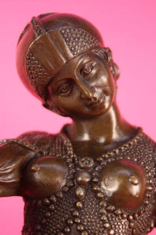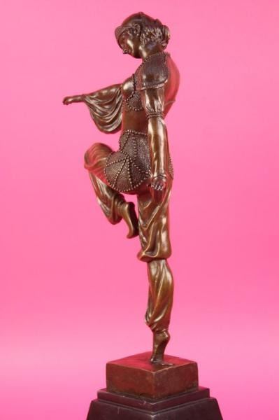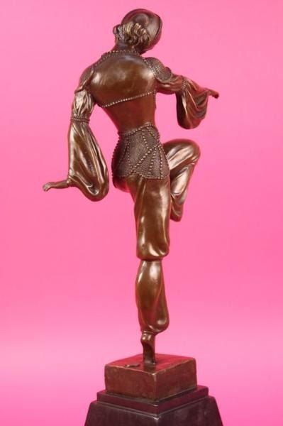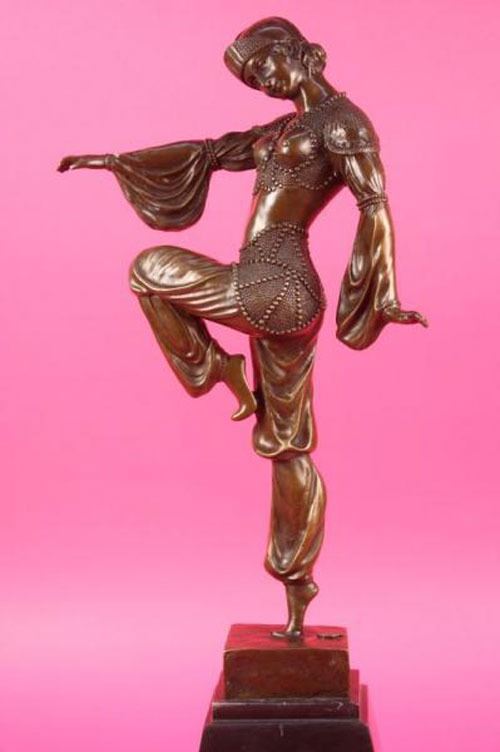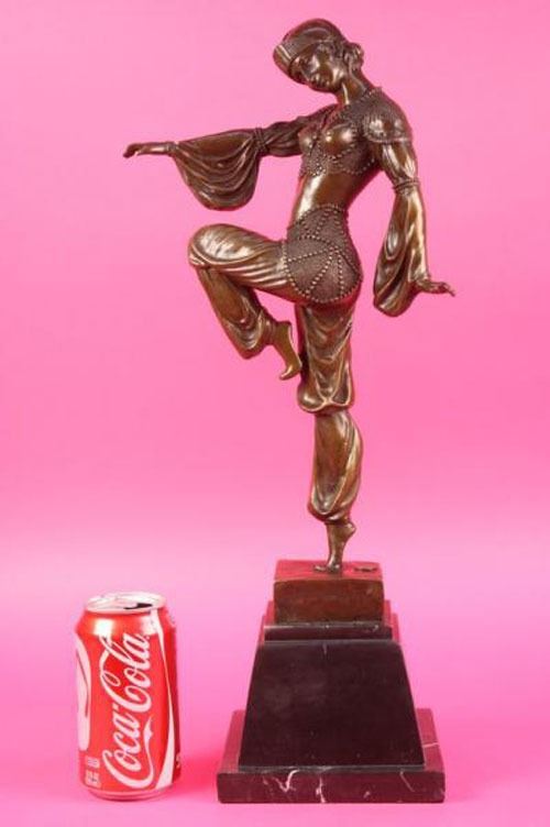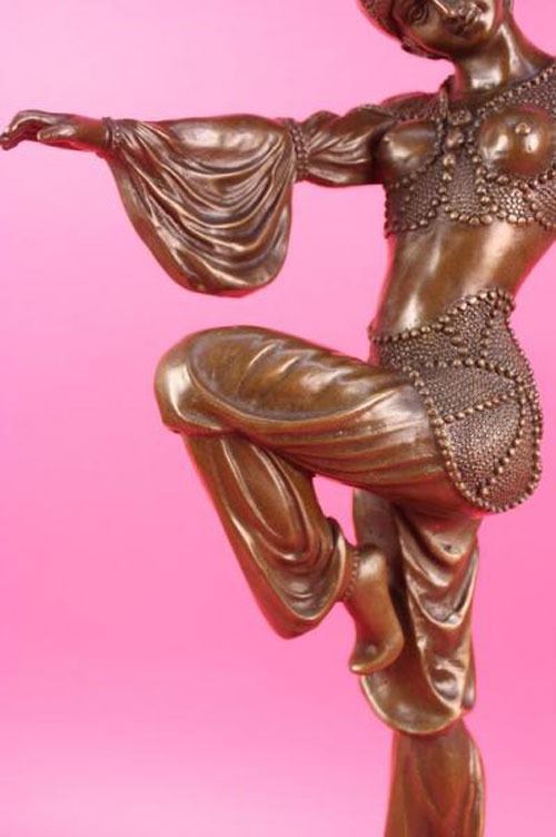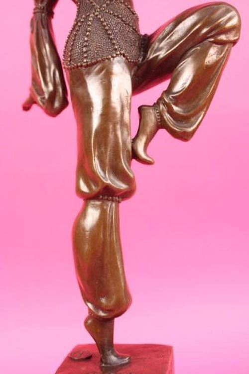This stunning dancer is one exquisite piece. She stand on her toes, while both her arms are spread one to the back of her and the other to the front. She is wearing earrings and a stylish neck-lace to go with her ankle bracelets. her gorgeous seashells style top with this astonishing skirt that dangles little cute circular beads up front, she is also wearing a gorgeous hat that covers most of her head and hair. she stands at the end of her performance proudly and excited about her grand finale. The feedback she gets from the crowd leaves her well pleased and delighted this amazing sculpture is in a brown patina and mounted on a marble fire red colored base. She was cast using the lost wax method. Bronze Dimensions with Marble Base: Height 20 X Width 10 inches. Weight: 15 LBS. Please Note: This is a reproduction bronze sculpture from the original molded and signed. This featured bronze sculpture is a recast after the original, and has been done recently. This 100% bronze sculpture is an abstract piece certain to be a conversation piece.Please Note: This is a reproduction bronze sculpture from the original molded and signed. This featured bronze sculpture is a recast after the original, and has been done recently. This 100% bronze sculpture is an abstract piece certain to be a conversation piece.