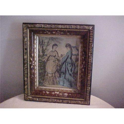 Godey Print in a Beautiful embossed deep shadow box frame; 2 ladies picking flowers in a garden