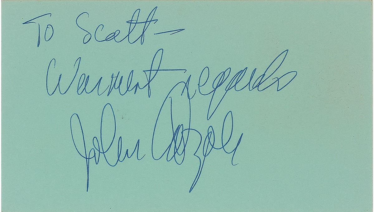 Character actor (1935–1978) who famously portrayed Fredo Corleone in Francis Ford Coppola's classic The Godfather. Sought-after ballpoint signature and inscription, “To Scott—Warmest regards, John Cazale,” on a light green 5 x 3 card. Reverse of card bears a collectors date notation of February 1, 1975. In fine condition.