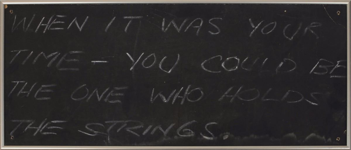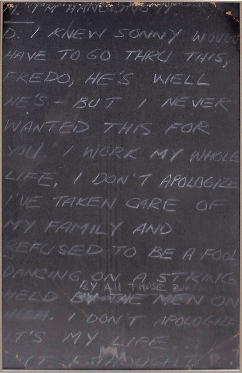 Remarkable pair of black cardboard cue cards used by Marlon Brando during the filming of the classic 1972 film The Godfather. Measuring 27.75 x 43.75 and 27.5 x 11.5, the cue cards, prepared to resemble a blackboard, are scrawled in large lettering with white chalk, and consist of a brief dialogue between Michael Corleone and his father, Don Vito Corleone, in which the latter famously offers his son the family business. In full: “M. I’m handling it. D. I knew Sonny would have to go thru this, Fredo, he’s well, he’s—but I never wanted this for you. I work my whole life, I don’t apologize, I’ve taken care of my family and refused to be a fool dancing on a string held by all those big shots on high. I don’t apologize. It’s my life…But I thought when it was your time—you could be the one who holds the strings.” Three words of the dialogue, “by the men,” were lightly smudged over and emended with the added “by all those big shots.” Framed and in overall very good to fine condition. Oversized. Originates from the estate of the Norton family, who famously allowed Francis Ford Coppola, Marlon Brando, and over one hundred crew members to spend a year filming The Godfather at their Staten Island mansion at 110 Longfellow Avenue.