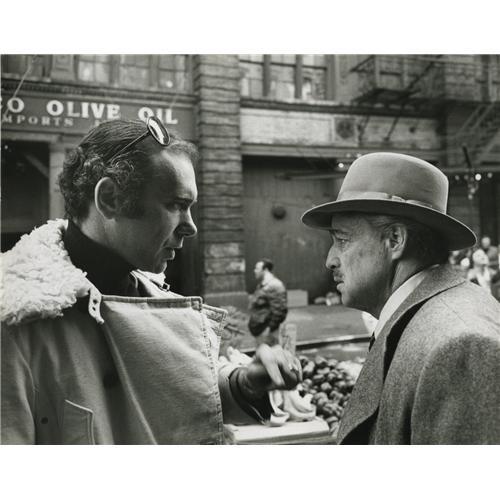<B>Photo of Marlon Brando as Vito Corleone with Albert S. Ruddy.</B></I> A wonderful b&w 14" x 11" silver gelatin print of Marlon Brando in conversation with producer Albert S. Reddy on the set of <I>The Godfather.</B></I> Taken by photographer Jack Stager, the print is in Excellent condition, with Stager's studio stamp on the back. <I>From the collection of Marlon Brando.</B></I>