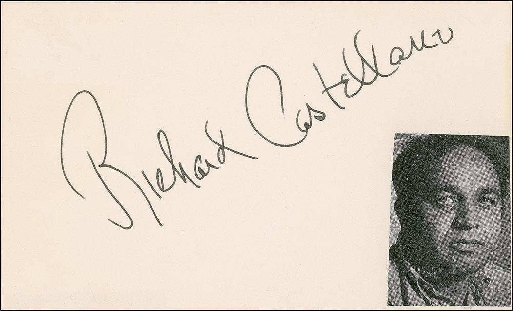 Academy Award–nominated actor (1933–1988) best known for his role as capo Pete Clemenza in the 1972 classic The Godfather. Castellano died of a heart attack at the age of 55. Uncommon vintage in-person ink signature, “Richard Castellano,” on an off-white 5 x 3 card with a clipped photo affixed to lower right corner. In fine condition.