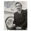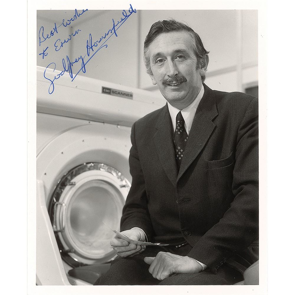 English electrical engineer (1919-2004) who shared the 1979 Nobel Prize for Physiology or Medicine with Allan McLeod Cormack for his part in developing an early prototype of the CAT scan. Glossy 4.5 x 5.5 photo of Hounsfield posing in front of his CT scanner, signed and inscribed in blue ballpoint, "Best wishes to Erwin, Godfrey Hounsfield." In fine condition.