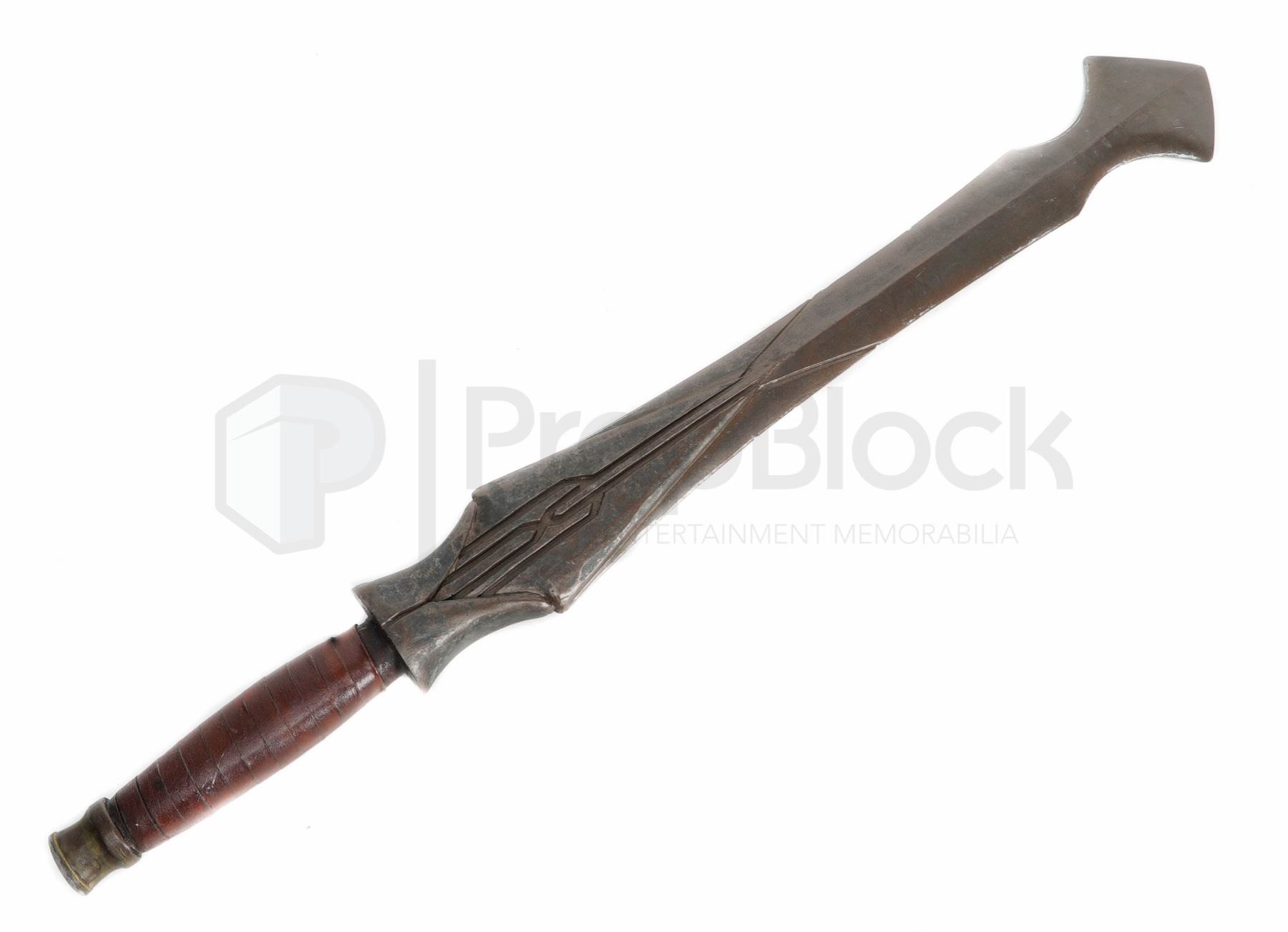 Automaton sword used in the production of the 2016 fantasy film Gods of Egypt. Mortal hero Set teams with the god Horus in an alliance against Set, the merciless god of darkness, who has usurped Egypt's throne, plunging the once peaceful and prosperous empire into chaos and conflict. These swords were sued by Toth's automatons in reaction to Horus's aggression toward Toth. Made of a dense urethane rubber, this piece is gold in color with a leather wrapped handle. This item remains in excellent, production used condition.