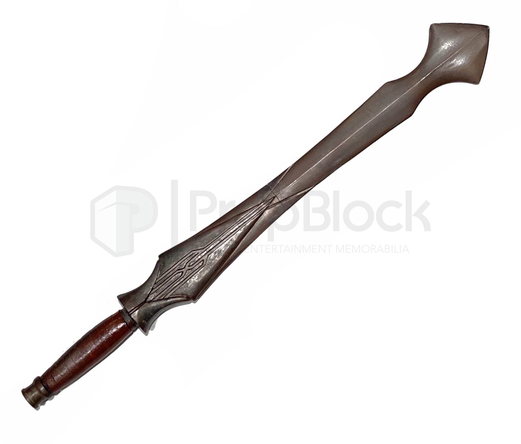 Automaton sword used in the production of the 2016 fantasy film Gods of Egypt. Mortal hero Set teams with the god Horus in an alliance against Set, the merciless god of darkness, who has usurped Egypt's throne, plunging the once peaceful and prosperous empire into chaos and conflict. These swords were sued by Toth's automatons in reaction to Horus's aggression toward Toth. Made of a dense urethane rubber, this piece is gold in color with a leather wrapped handle. This item remains in excellent, production used condition.