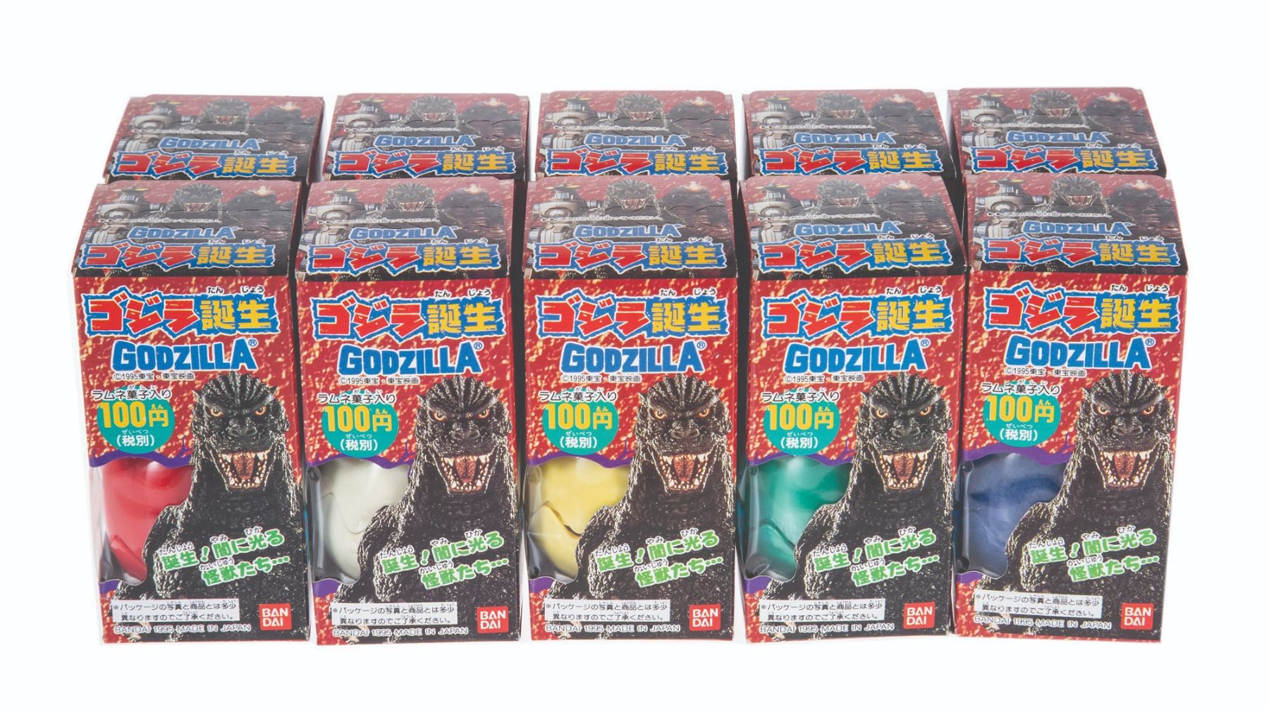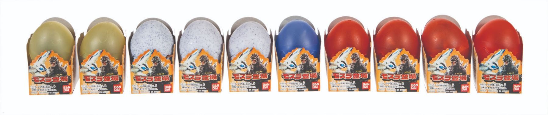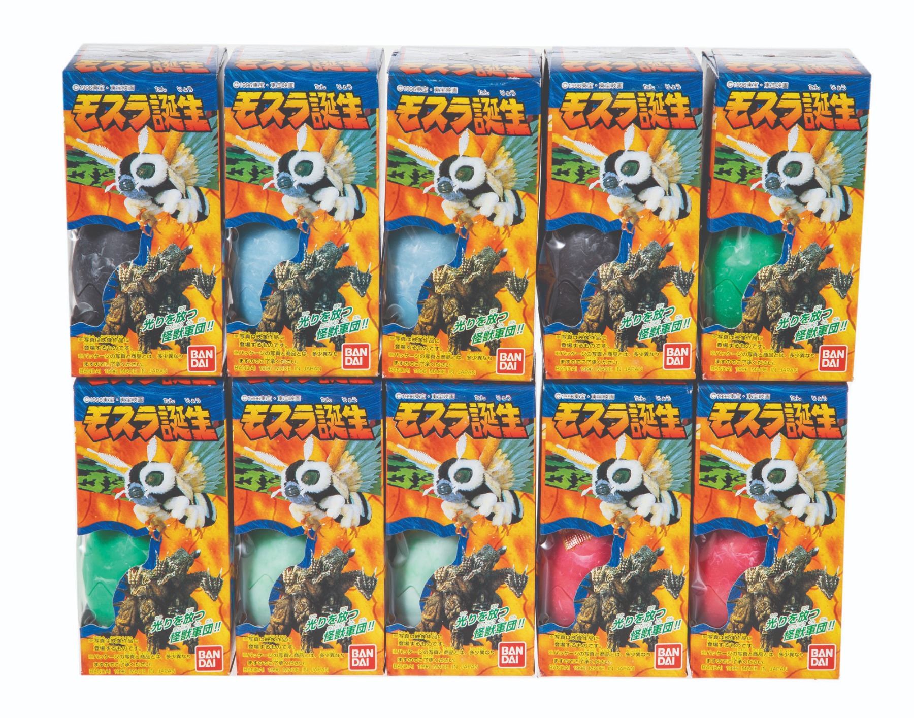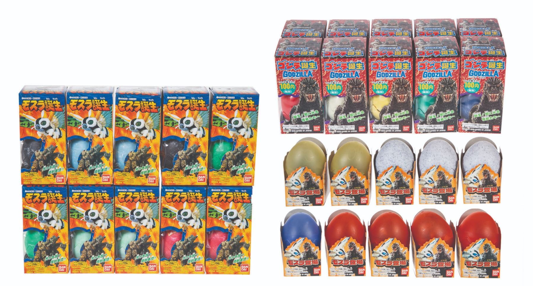1995/96/98. Bandai Godzilla Tanjo 2 Egg Set Lot of 10 Boxed figures & POS Box/Bandai Mothra Tanjo Egg Set Set of 10 w/ POS Box/Bandai Mothra Appears Egg Set Set of 10 w/ POS Box. Figures: 1” tall. VG+.