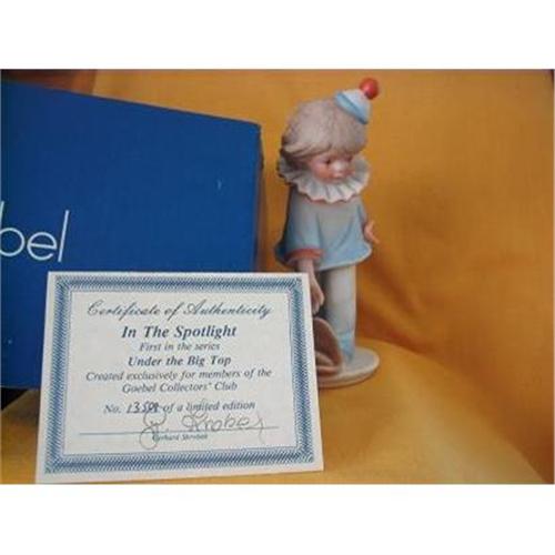 This Goebel Collectors Club piece "In the Spotlight" was designed by artist Gerhard Skrobek in 1983 and is marked: Limited Edition Series/Under The Big Top/In The Spotlight by Gerhard Skrobek/Number 13508/Goebel 1983/USA/Goebel Collectors' Club on the bottom with the initials JK and on the back base behind his feet, the piece is signed Skrobek. An unhappy little clown with his hand extended to show the rather large hole he has in his shoe. Dressed in colors of red, white and blue he comes in his original box with certificate of authenticity. In very good + condition with out chips or cracks he measures 7 inches tall, 4 7/8 inches wide and 3 1/2 inches deep. A great addition to any Goebel Collection.<BR>SH & Ins. will be quoted after orders placed. If you have questions feel free to contact me and thank you for looking.