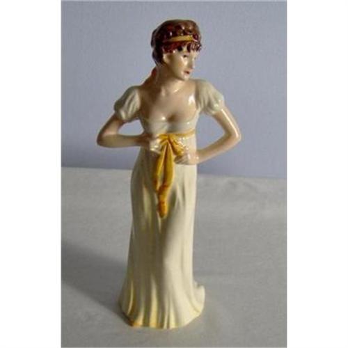 This lovely figurine is part of a Goebel series called Fashion on Parade, produced in the 1980s. This series spanned the years from 1800 to 1935 and showed representative fashions from those times. She wears the high-waisted style gown known in the Regency Period and Jane Austen novels in England. She has a yellow sash and cocks her head in the coquettish, yet demure, way of her day. This figure is 8 1/2 inches tall and is signed. This figure may be purchased with the "Cosmopolitan" and "Strolling on the Avenue" figures as part of a set for $245. <p>Shipping is determined after checkout. <p>