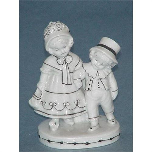 A small porcelain figure, 3 3/ 4" tall, of young girl pulling her little brother along by the arm. White with black detailing. Behind the two figures is a small tube that could be a small vase to hold some tiny flowers. Marked on bottom with the goebel crown, and the impressed word depose. Condition is very good no chips or cracks.