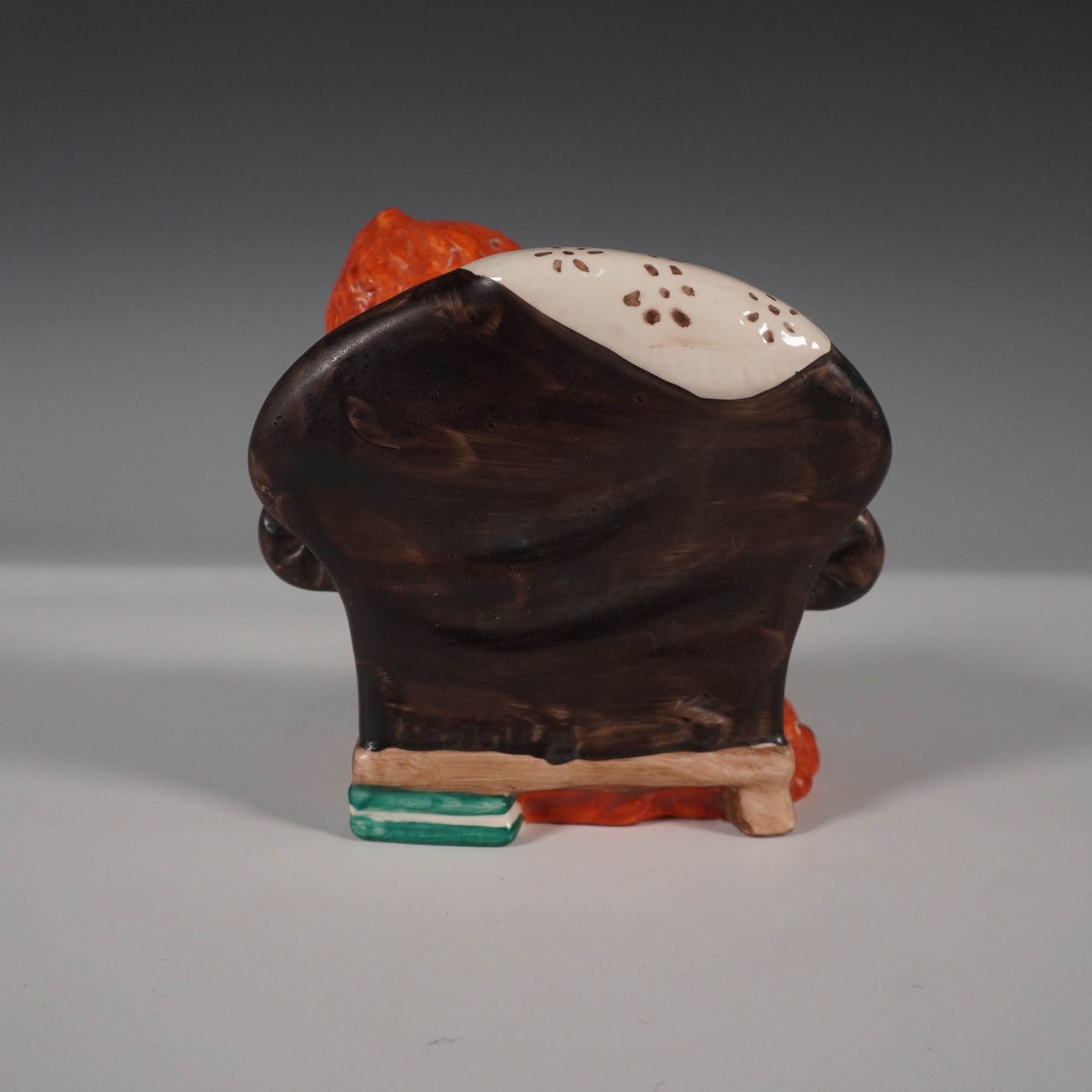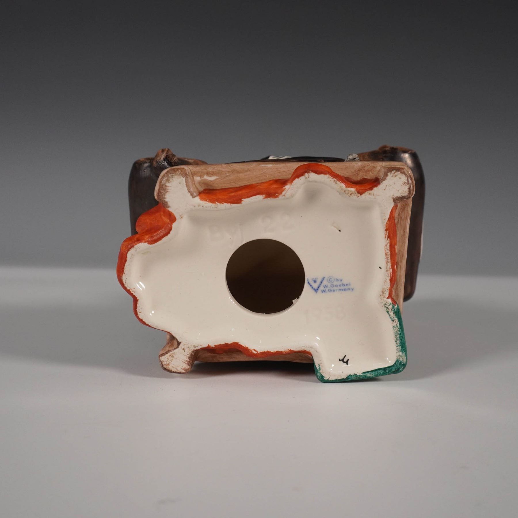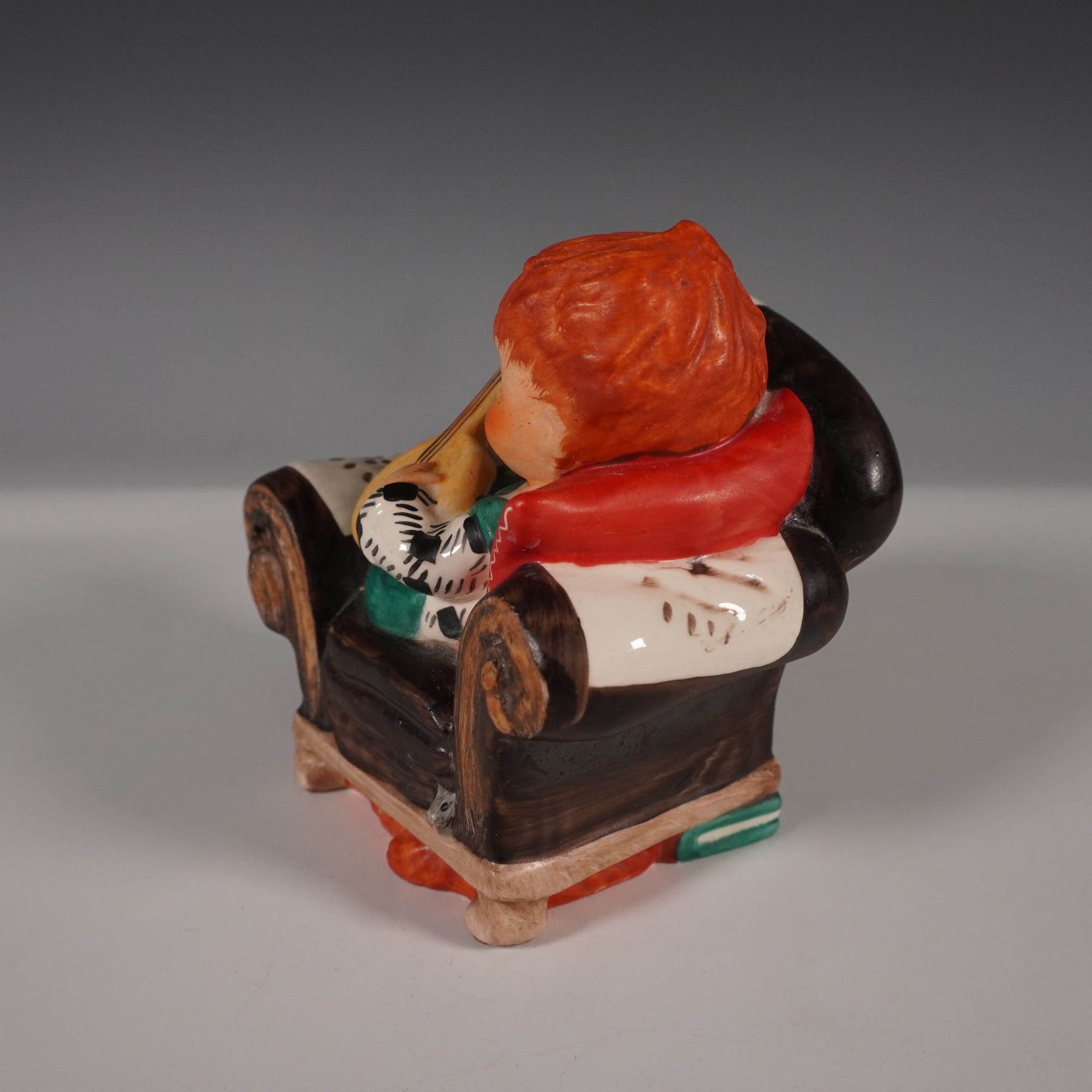 Charming Goebel Hummel figurine, model Byj 22, titled Off Key, crafted in West Germany and dated 1958. This hand-painted ceramic figurine features a young child with vibrant red hair seated in a cozy armchair, joyfully playing a stringed instrument. The detailed composition includes a finely decorated chair with lace-like accents and a small cat peeking from beneath. The base bears the Goebel W. Germany hallmark along with the model number. A delightful collectible showcasing Goebel's craftsmanship and storytelling artistry.
