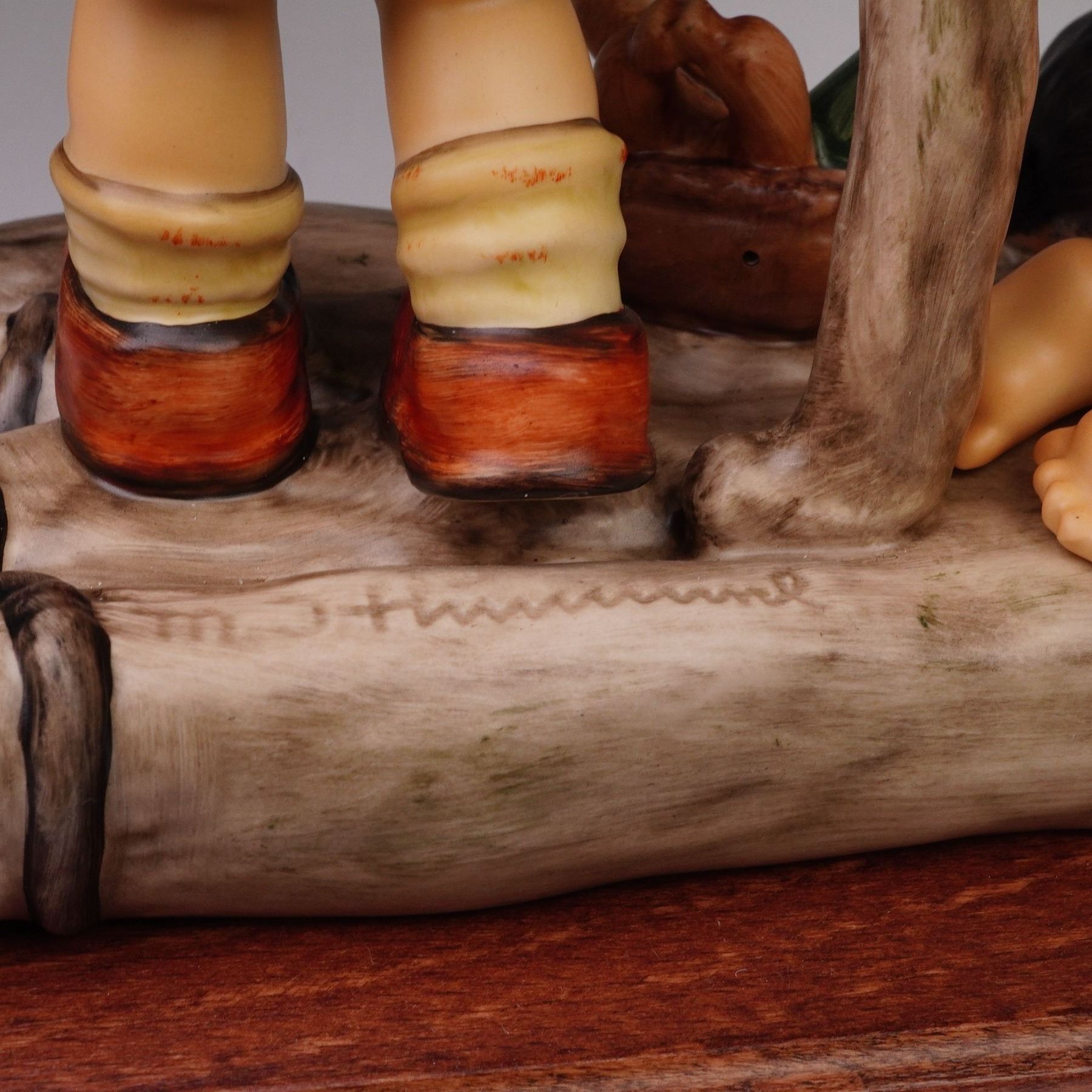 M.I. Hummel figurine titled Summer Adventure, depicting two children on a wooden raft with a dog, basket, and sail, mounted on a wooden base with title plaque. Includes original certificate and presentation box. Marked to the base with Goebel Germany and Hummel Club backstamps.