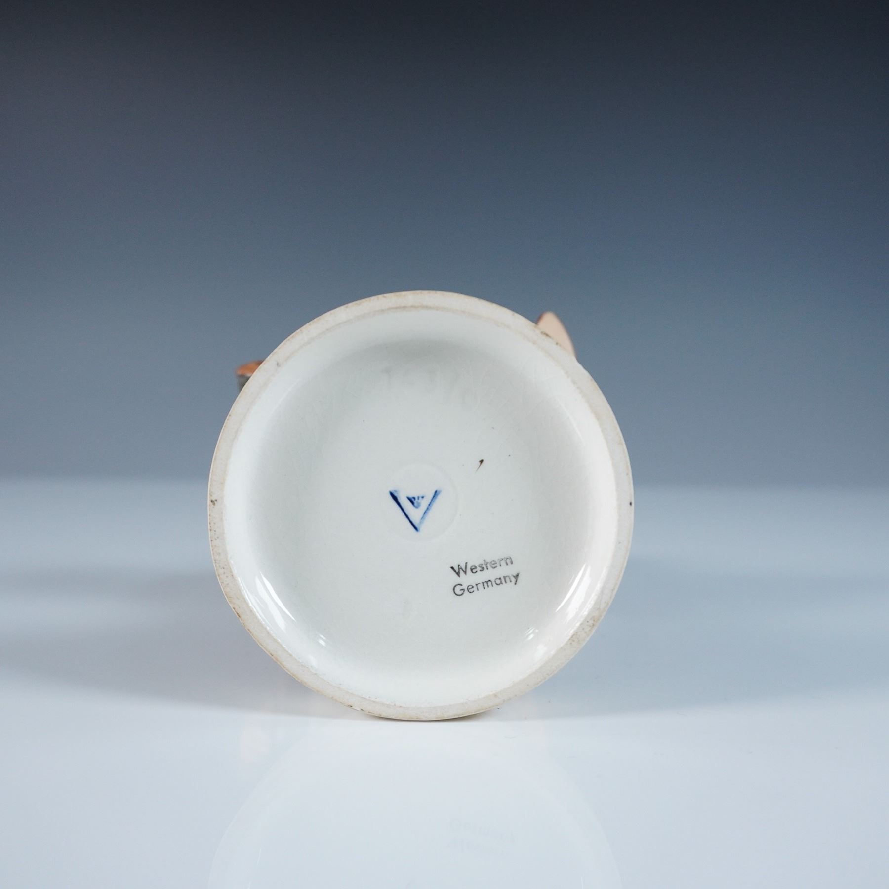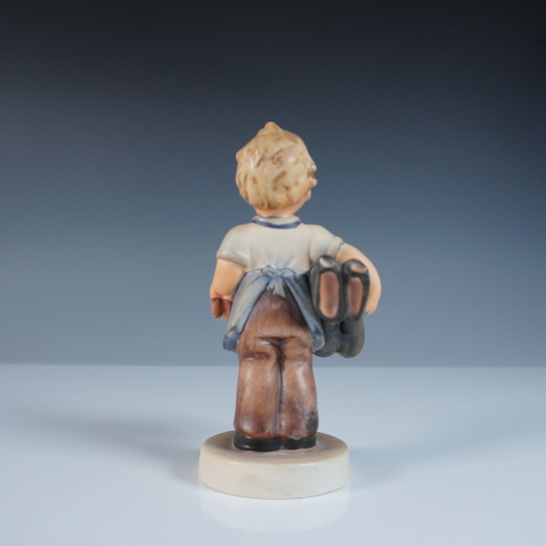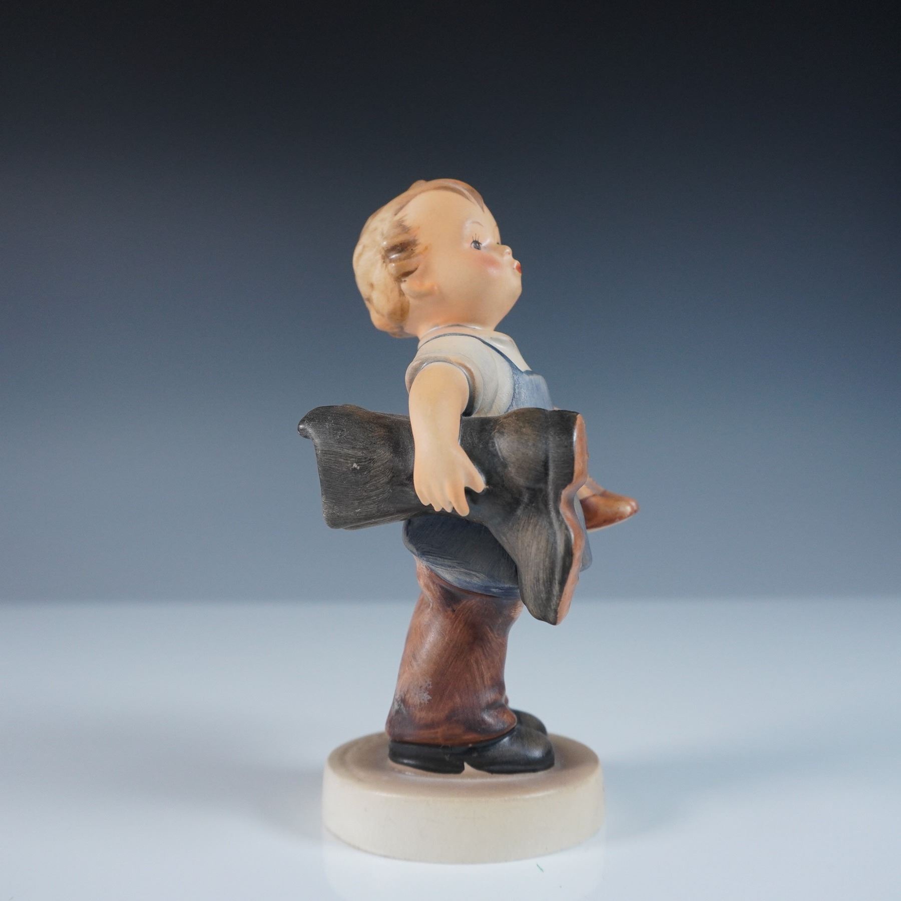 Charming Goebel Hummel porcelain figurine titled Boots, model 143/0. This figurine depicts a young boy wearing a blue apron, carrying a large pair of boots in one hand and a smaller pair in the other. Hand-painted with fine detail, it exemplifies the craftsmanship and whimsical charm characteristic of Goebel Hummel pieces. The underside bears the Goebel Hummel backstamp.