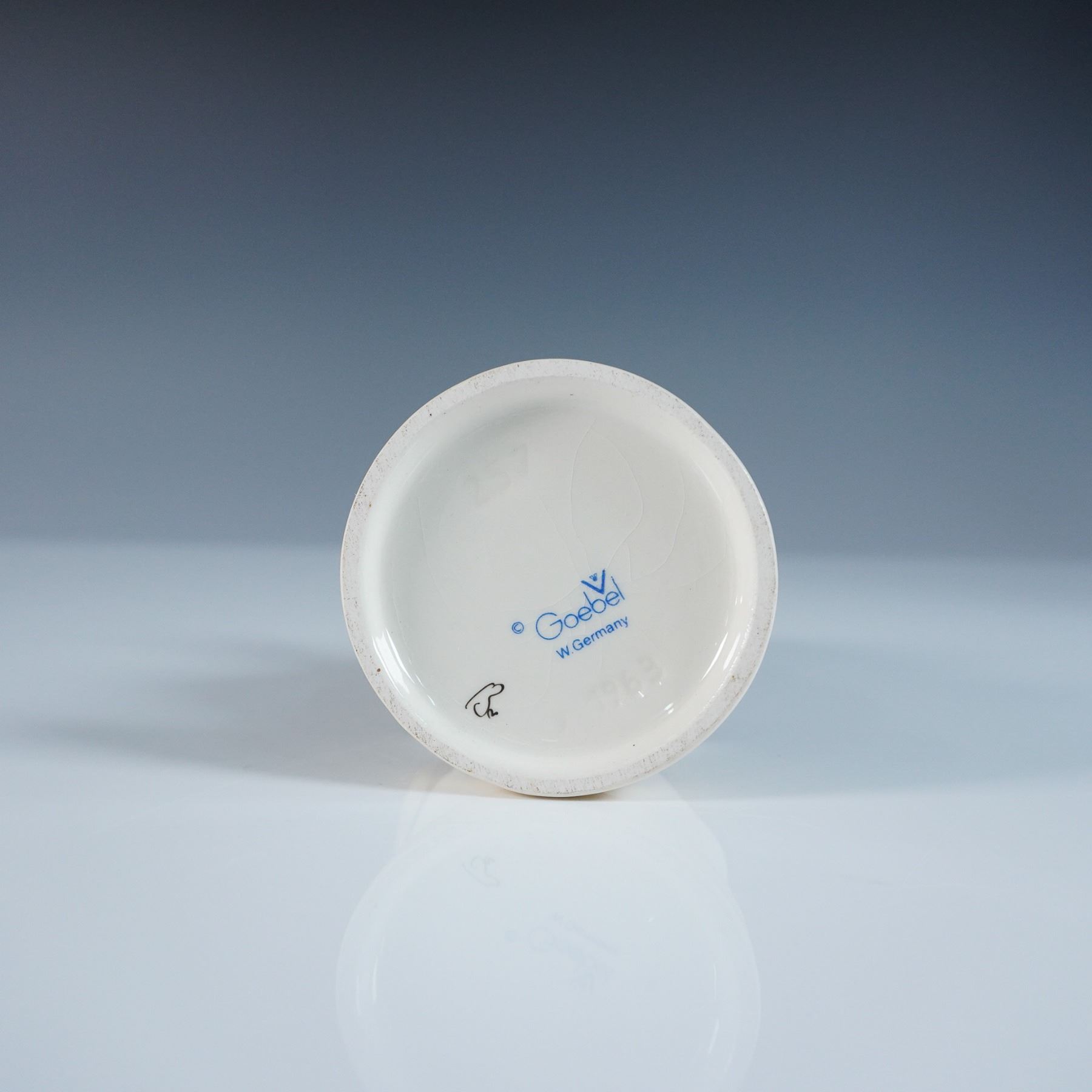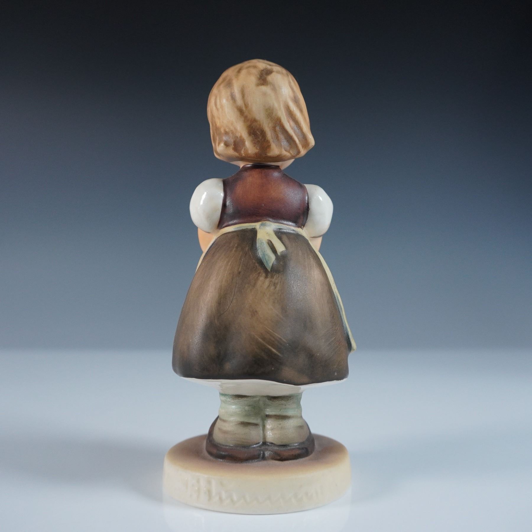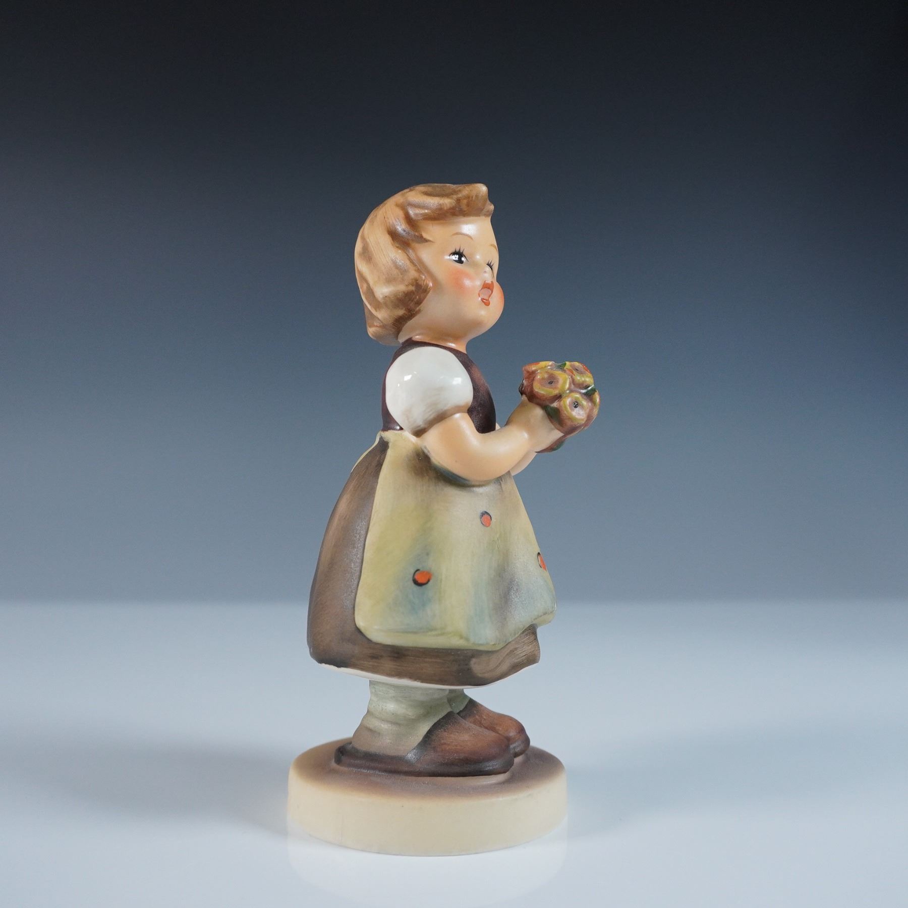 Charming Goebel Hummel porcelain figurine titled For Mother, model 257. This endearing piece depicts a young girl in a traditional dress holding a bouquet of flowers, her expression filled with warmth and innocence. Marked on the underside with the Goebel Hummel Backstamp.