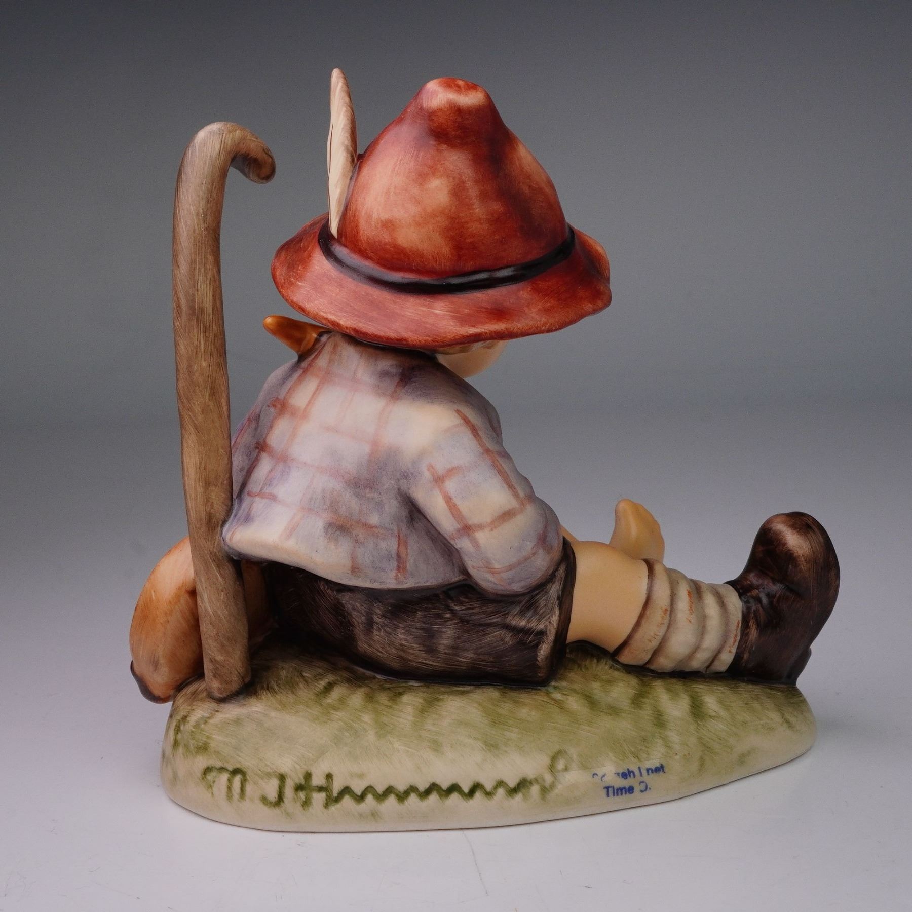 Charming Goebel M.I. Hummel porcelain figurine titled Time Out (470), first issued in 2007. This finely crafted piece depicts a young boy in traditional Bavarian attire, resting with his head bowed and holding a violin across his lap, seated on a grassy base with painted flowers. The figurine showcases the signature Hummel artistry with hand-painted details and warm color tones. Underside marked with Goebel backstamp, "First Issue 2007," and additional identifiers. Includes original box.