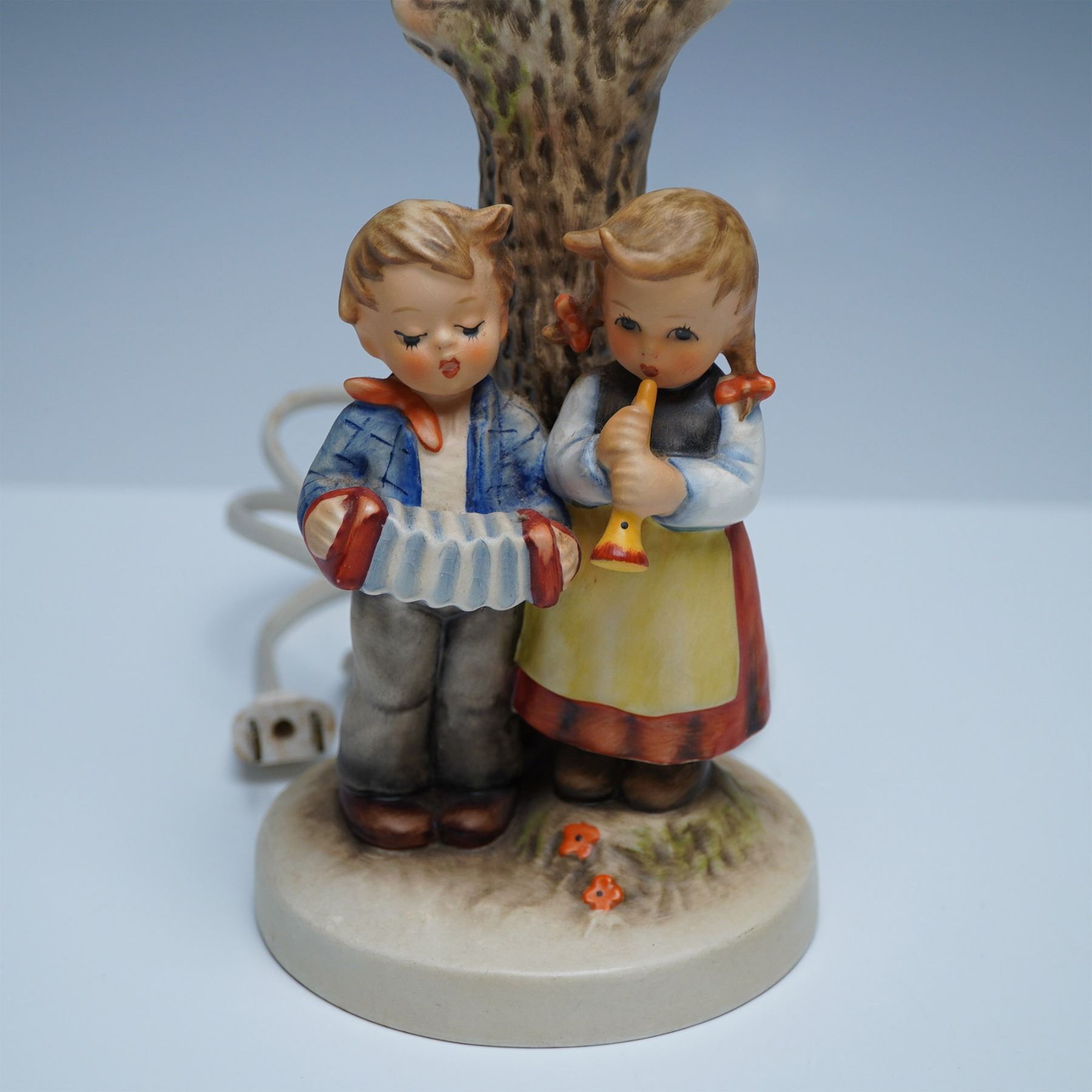 Charming vintage Goebel Hummel porcelain table lamp titled Birthday Serenade. This delightful piece features two children playing music together, standing beside a tree trunk that forms the lamp’s base. Handcrafted in West Germany, this lamp showcases the iconic Hummel artistry with detailed hand-painted features and soft pastel tones. The underside bears the Goebel Hummel backstamp.
