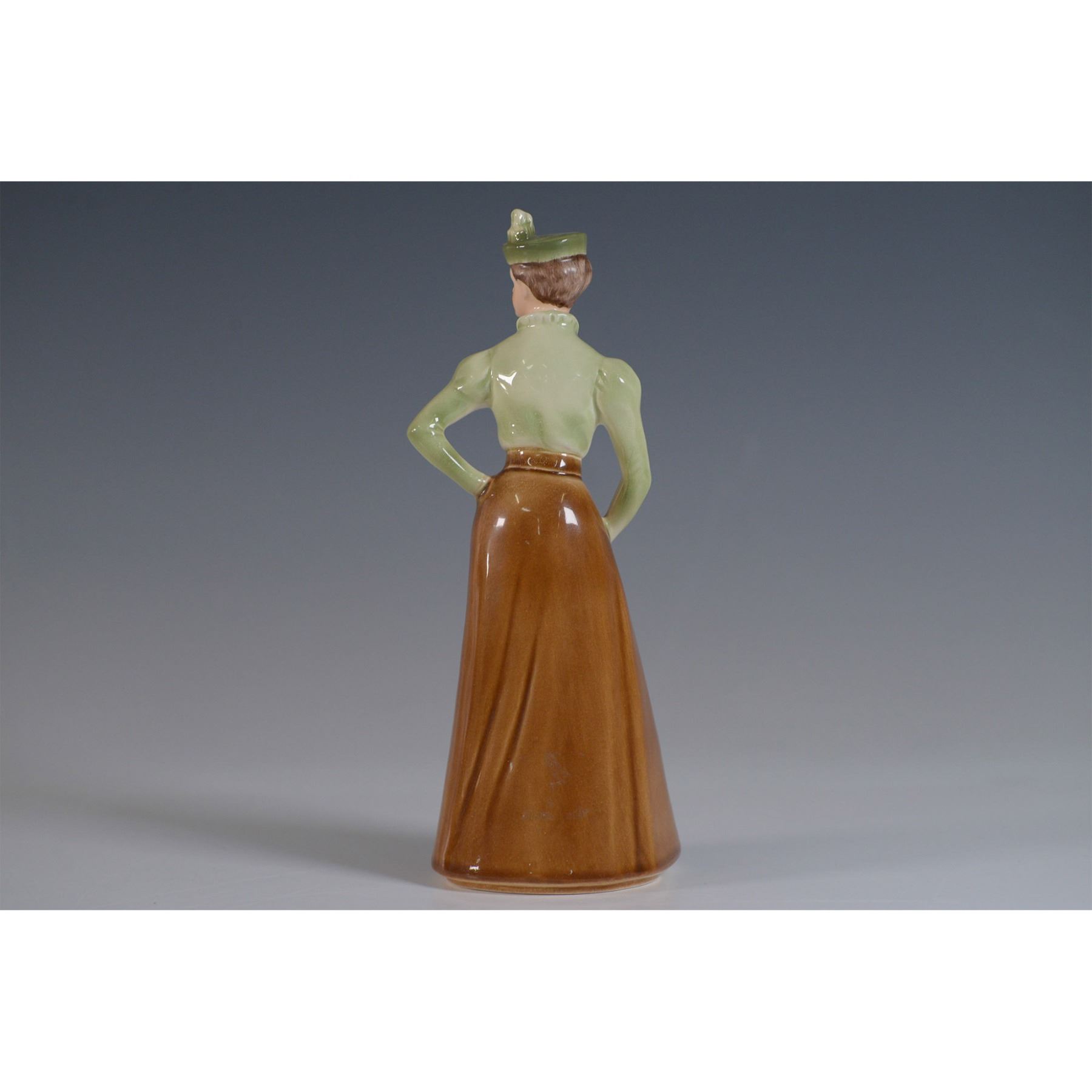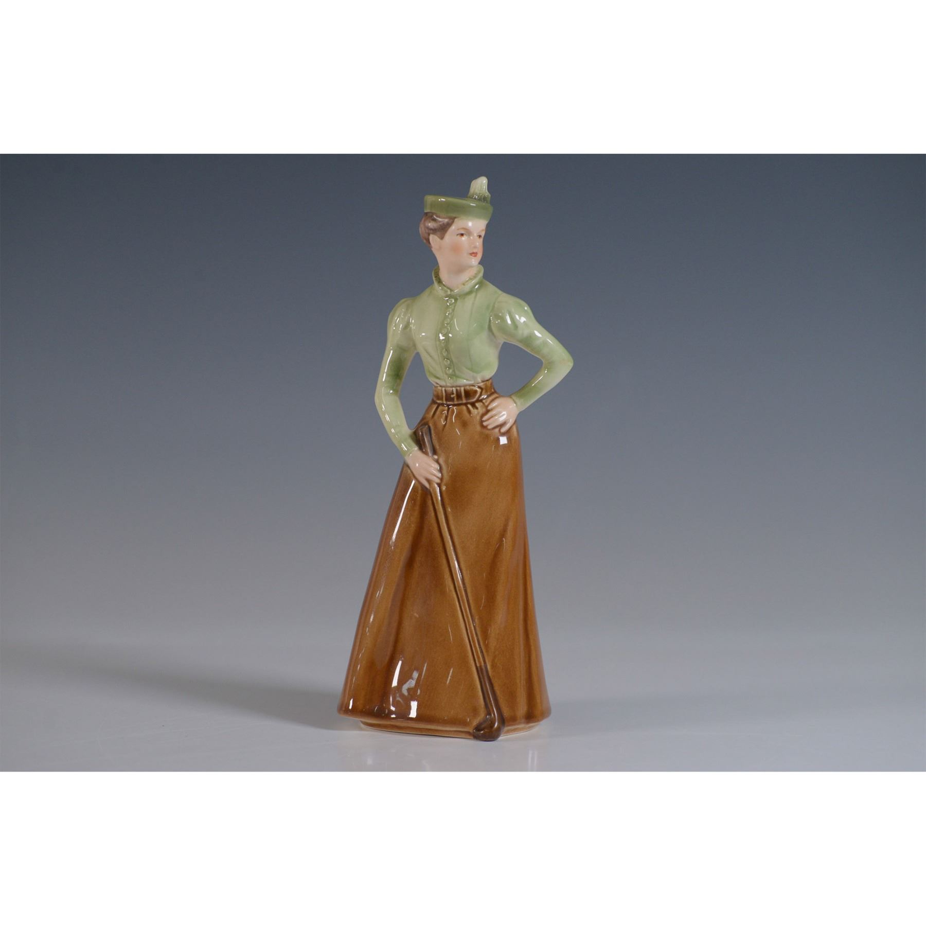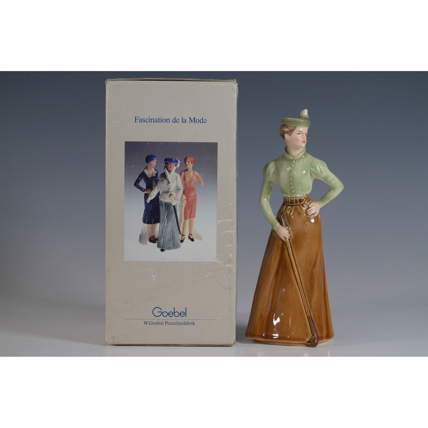 Elegant Goebel porcelain figurine titled On The Fairway, depicting a stylishly dressed female golfer in a Victorian-era ensemble. She wears a green blouse, brown skirt, and a matching hat adorned with a feather while holding a golf club, exuding a poised stance. This figurine is part of the Fascination de la Mode collection and is marked Goebel W. Germany on the base. Includes the original box. Figurine measures approximately 8.75"H, and the box dimensions are 5"L x 5"W x 9.5"H.