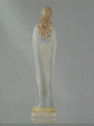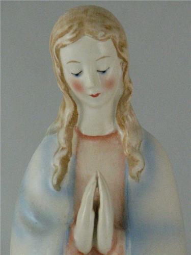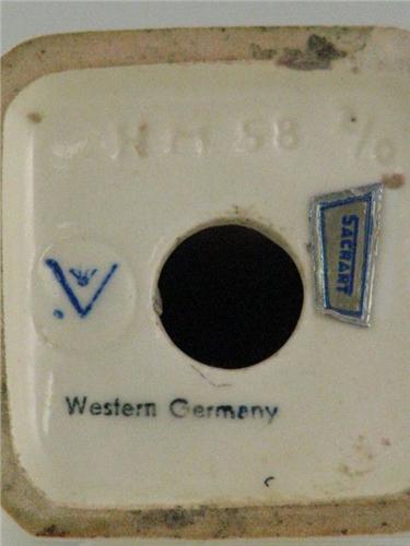 Goebel Sacrart Western Germany Lady Madonna Figurine. Marked: Incised MM58 2/0, TMK 3 (1957), Western Germany. Blue and silver foil "Sacart" label attached. Beautiful pastel colors. Condition: one small chip in base. Dimensions: 9"H.