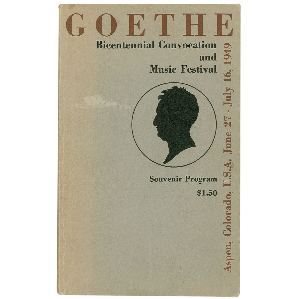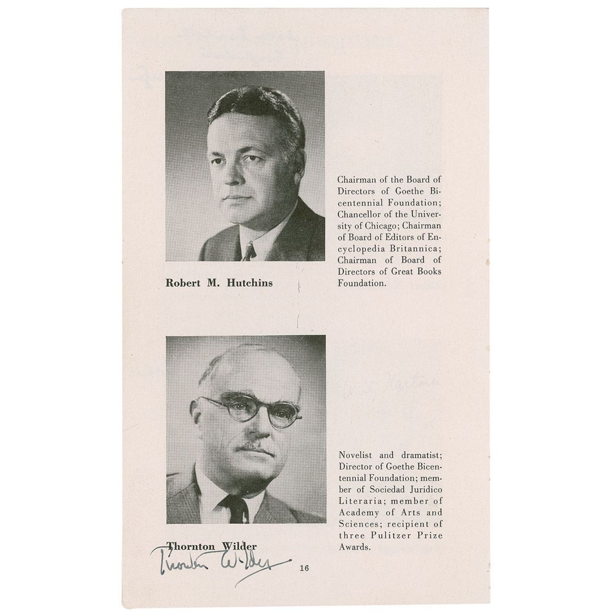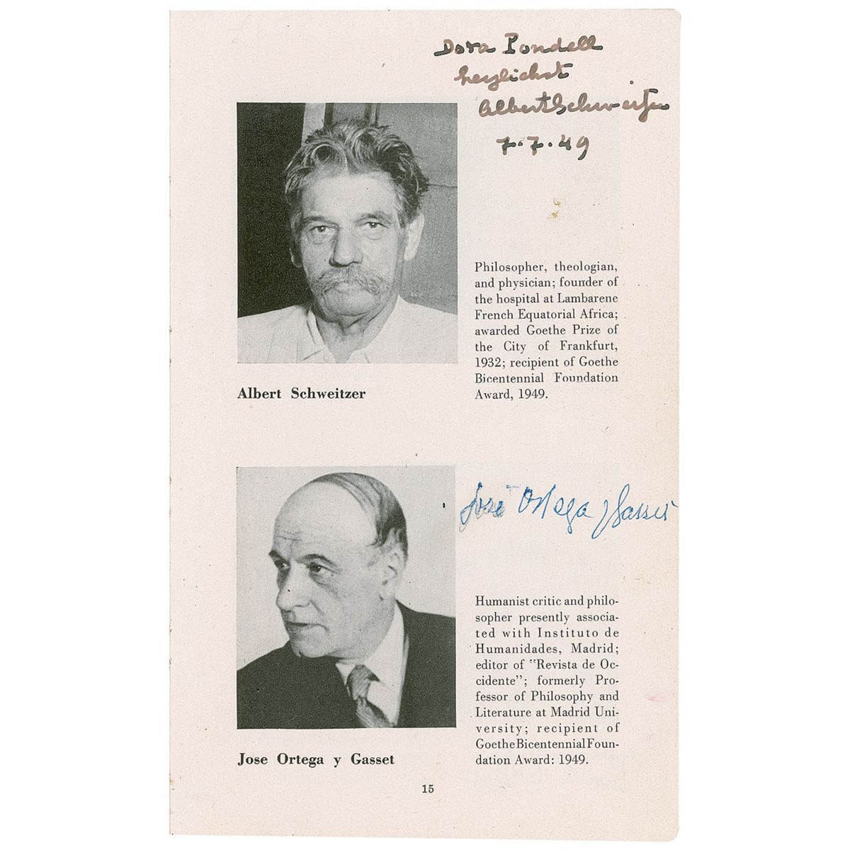 Souvenir program from the “Goethe Bicentennial Convocation and Musical Festival,” held at Aspen, Colorado, from June 27–July 16, 1949, 5.5 x 8.75, 160 pages. Signed inside in ink by 13 participants, including Albert Schweitzer (ins), Jose Ortega Y Gasset, Thornton Wilder, Ernst Robert Curtius, Barker Fairley, William Hocking, Ludwig Lewisohn, Dimitri Mitropoulos, T. M. P. Mahadevan, and Herta Glaz. All 13, except mezzo-soprano Herta Glaz and Walter Hallstein (author of the "Hallstein Doctrine") have signed next to their photos. Scattered toning to cover, expected handling wear, and small area of surface loss to front cover, otherwise fine condition.